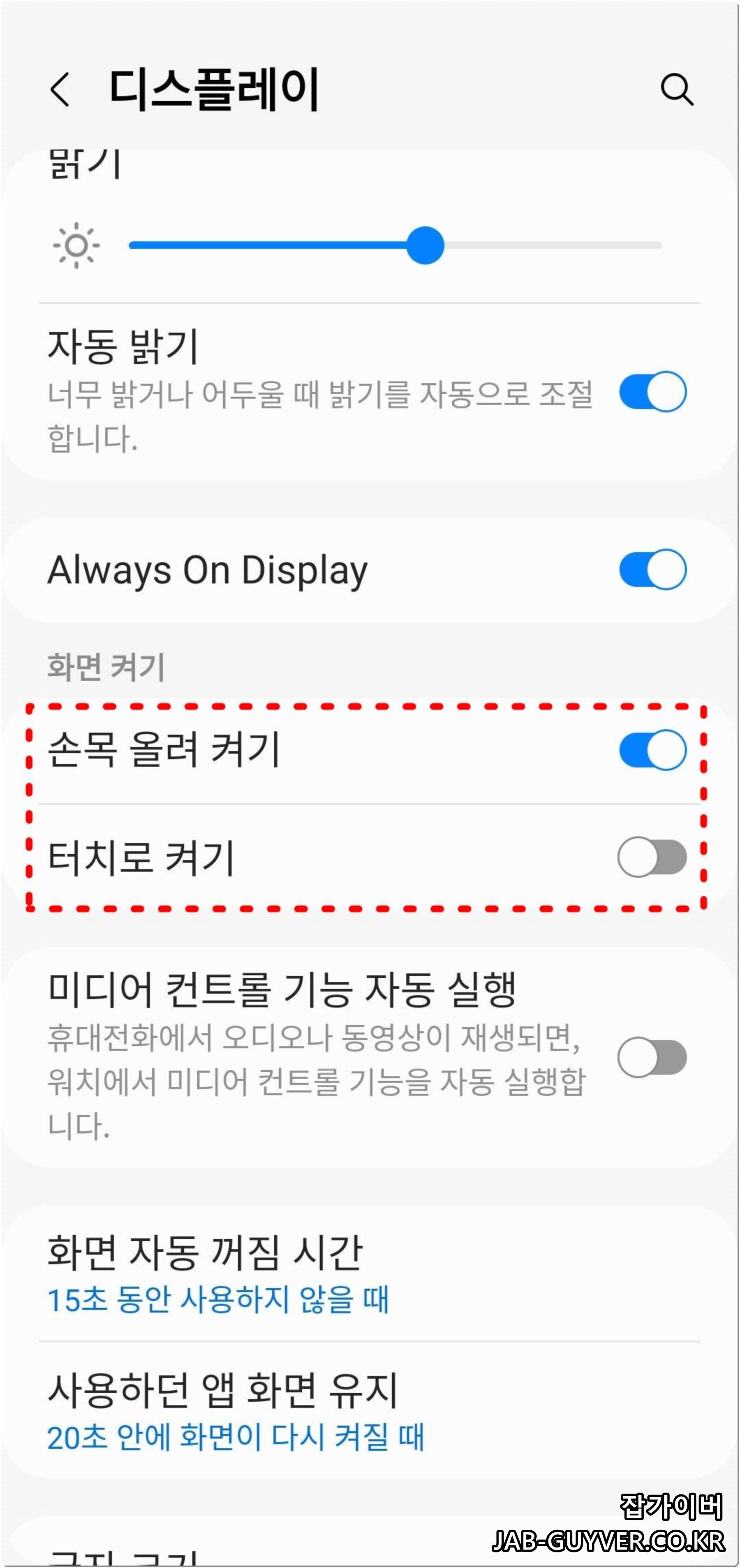 AOD가 켜져 있더라도 손목 올려켜기 기능이 함께 활성화되어 있다면, 손목을 들어올릴 때 전체 화면이 잠시 켜집니다.