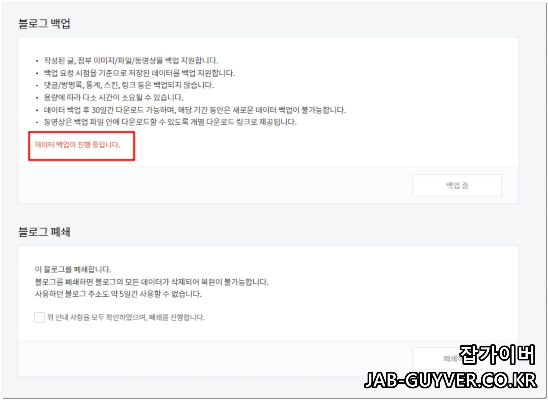 이렇게 백업을 선택하면 티스토리 블로그 규모에 따라 데이터 백업의 시간은 각각 차이가 있으며 백업이 진행됩니다.