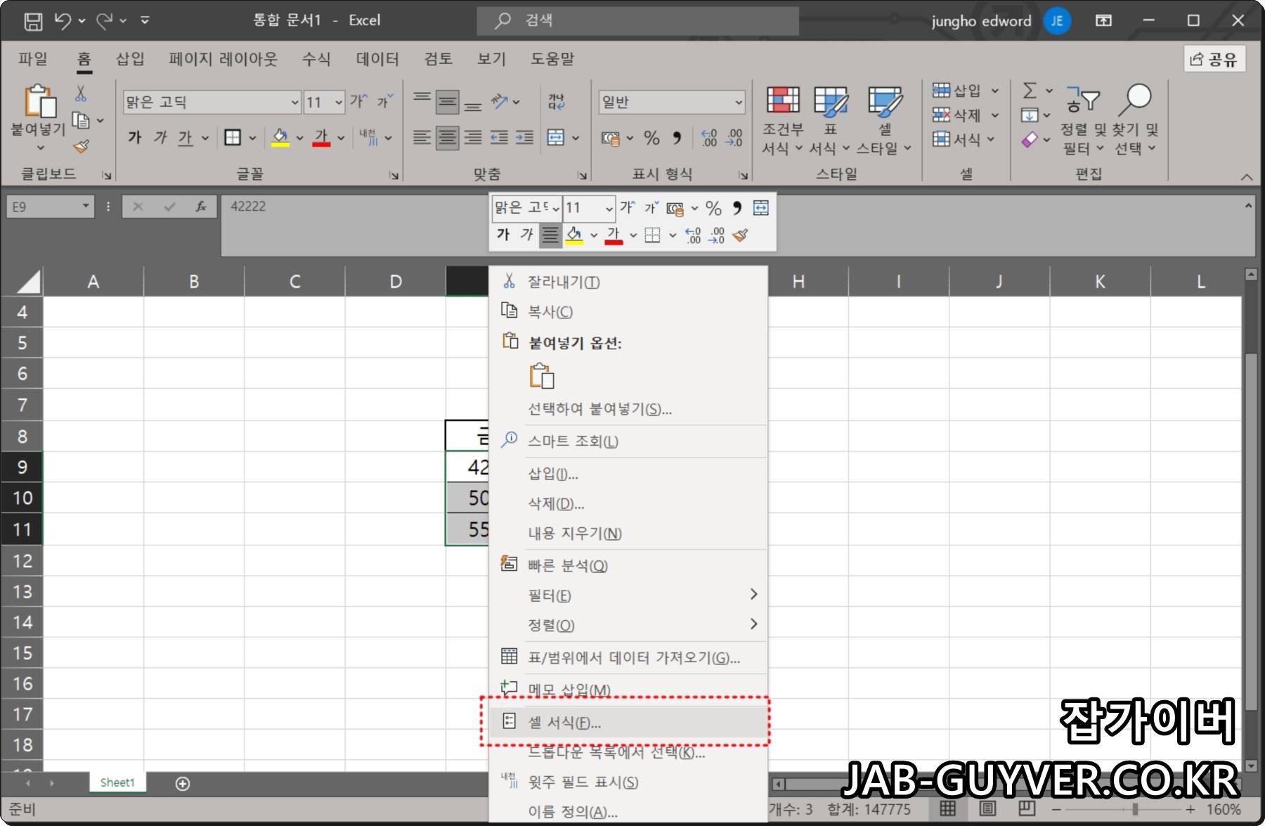 먼저 금액이 들어 있는 영역을 마우스로 드래그해서 선택한 다음, 마우스 오른쪽 버튼을 눌러 셀 서식 메뉴로 들어갑니다. 여기서 “표시 형식”을 숫자나 통화로 바꾸면서 천 단위 구분 기호(,)를 켜두면 42222 같은 값이 42,222처럼 훨씬 읽기 좋은 모양으로 바뀝니다.