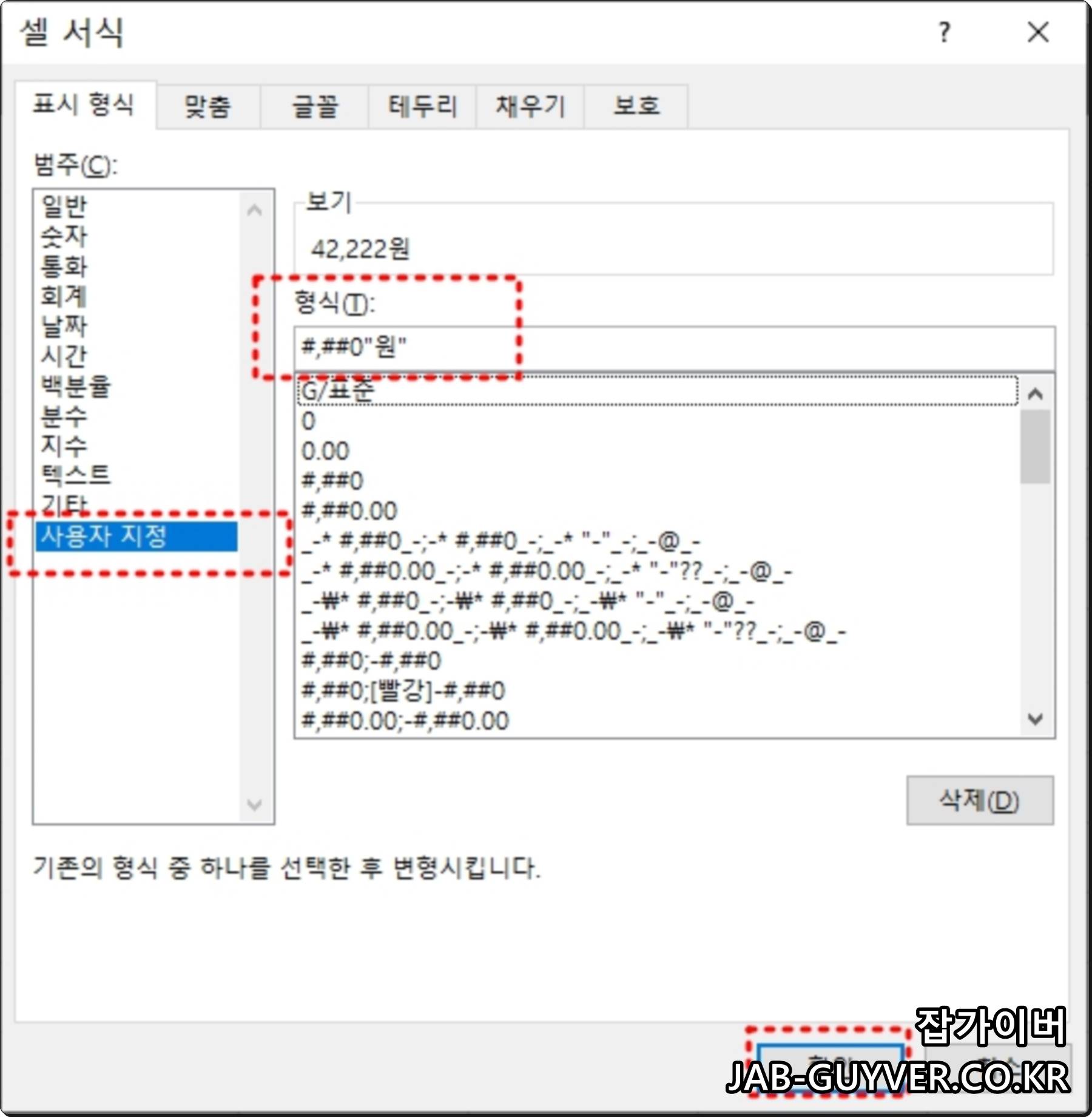 이 서식을 적용하면 셀에 42222라고 입력되어 있어도 화면에는 42,222원처럼 보입니다.