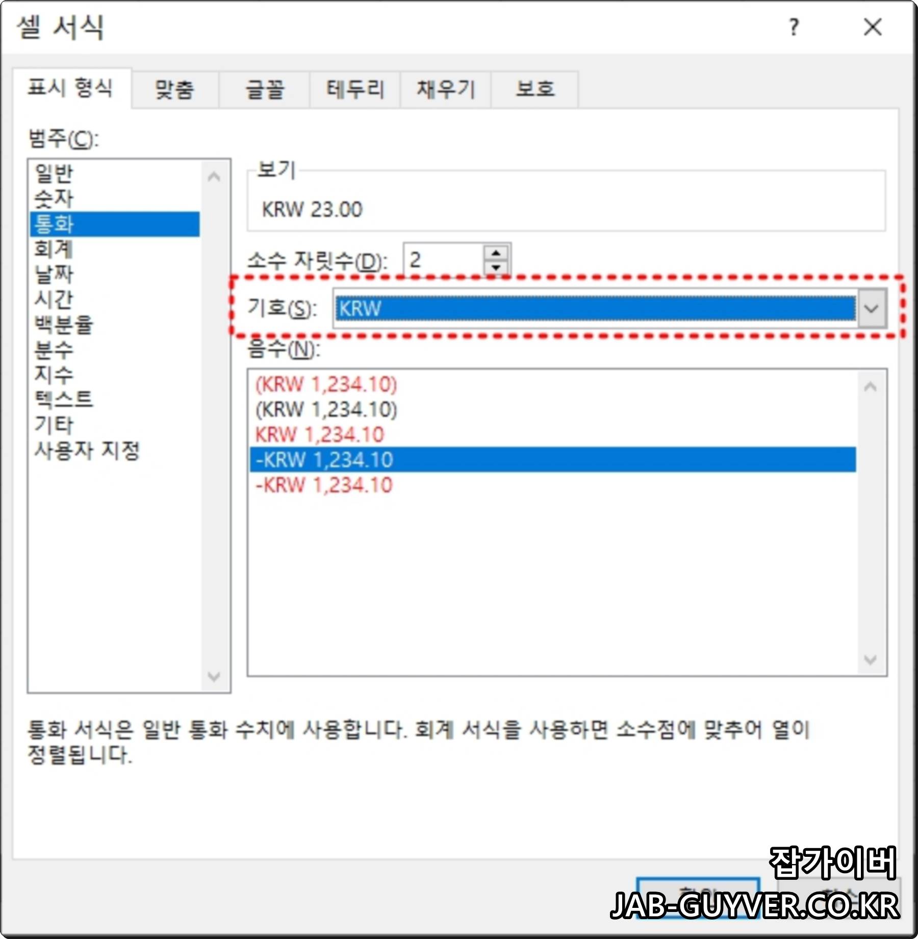 통화 서식에서는 보통 ₩, $, €, ¥ 같은 기호들을 선택해서 표시합니다.