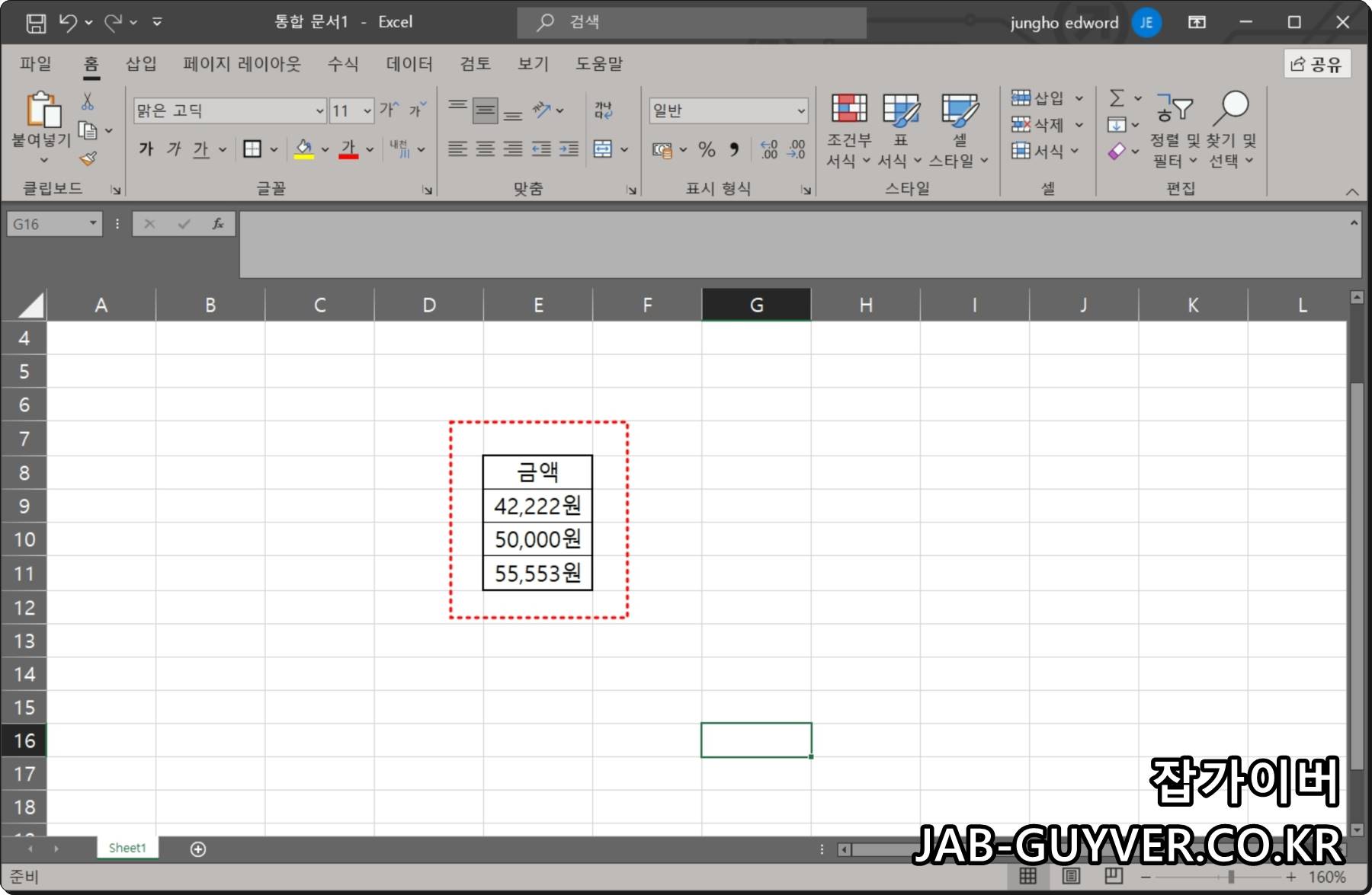 계산이 들어가는 금액이라면 반드시 숫자만 입력하고 “원”은 서식으로 처리하는 게 안전합니다.
