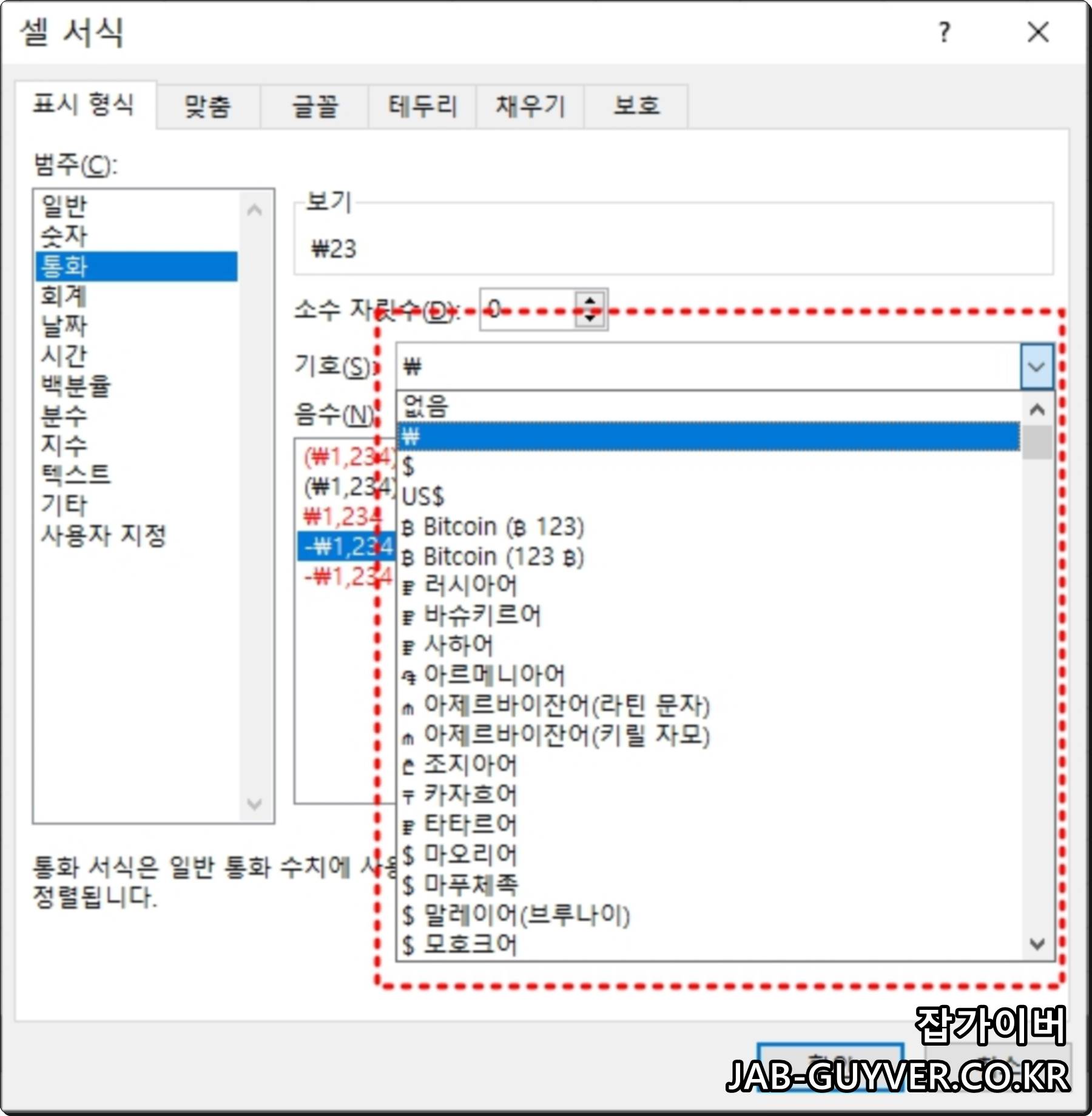 통화 서식에서는 보통 ₩, $, €, ¥ 같은 기호들을 선택해서 표시합니다.