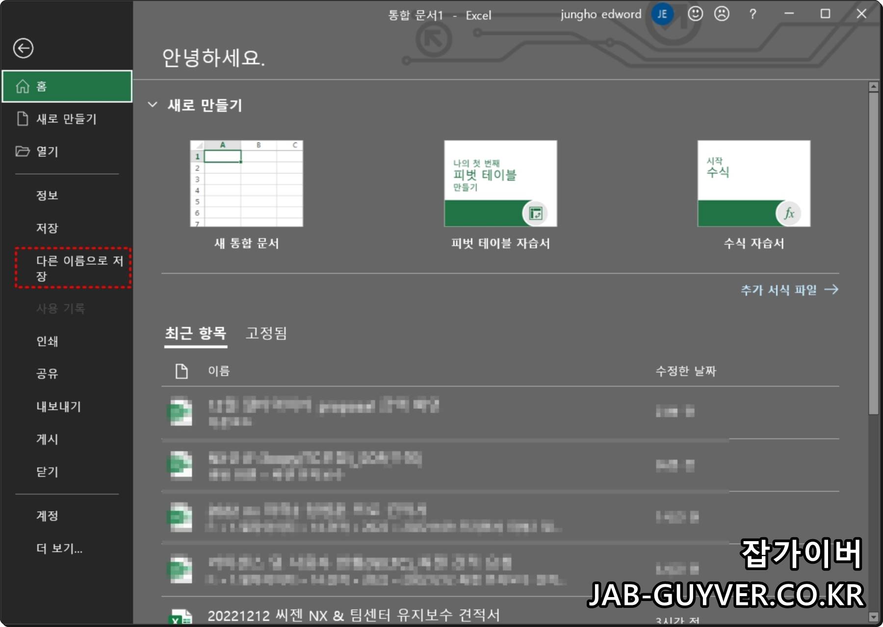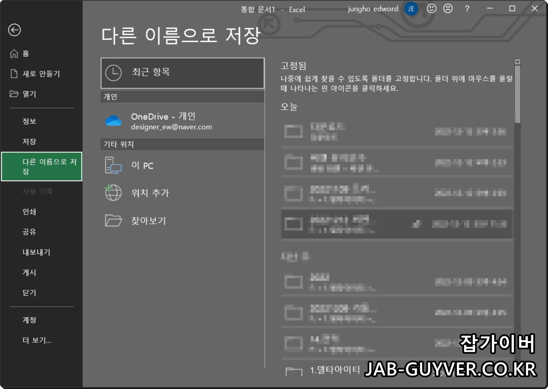 우선 압축하고자 하는 엑셀시트를 열어 다른이름으로 저장 -  찾아보기를 눌러줍니다.