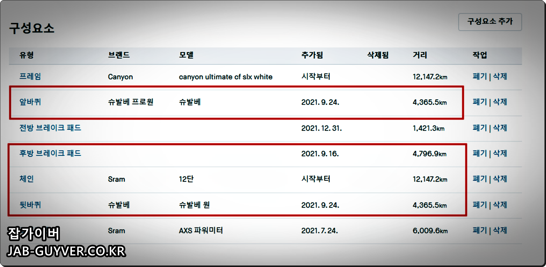 우선 스트라바의 자전거 구성품을 등록해 두면 각 부품별 사용기간 및 사용거리를 각각 확인할 수 있습니다.