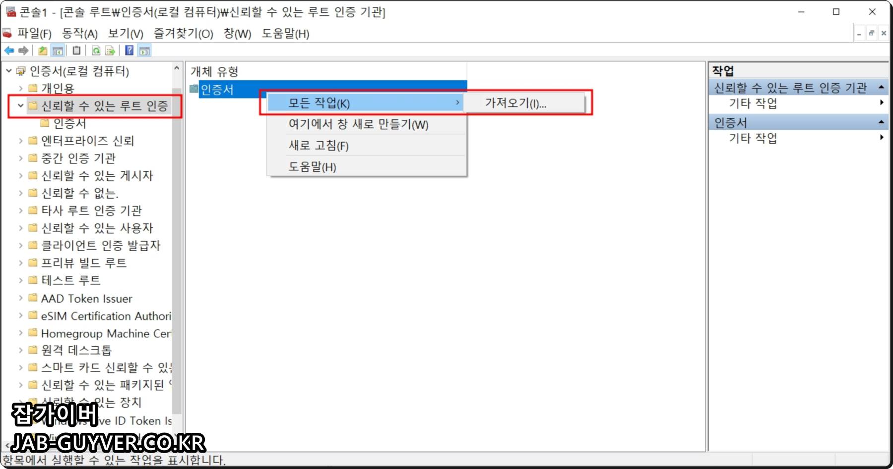 신뢰할 수 있는 루트인증에서 인증서 항목을 우클릭 후 모든작업 -> 가져오기를 눌러줍니다.