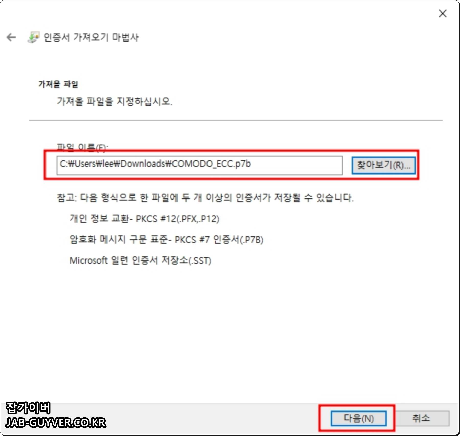 인증서 가져오기 마법사를 통해 앞서 다운로드 받은 코모도 인증서를 추가합니다.