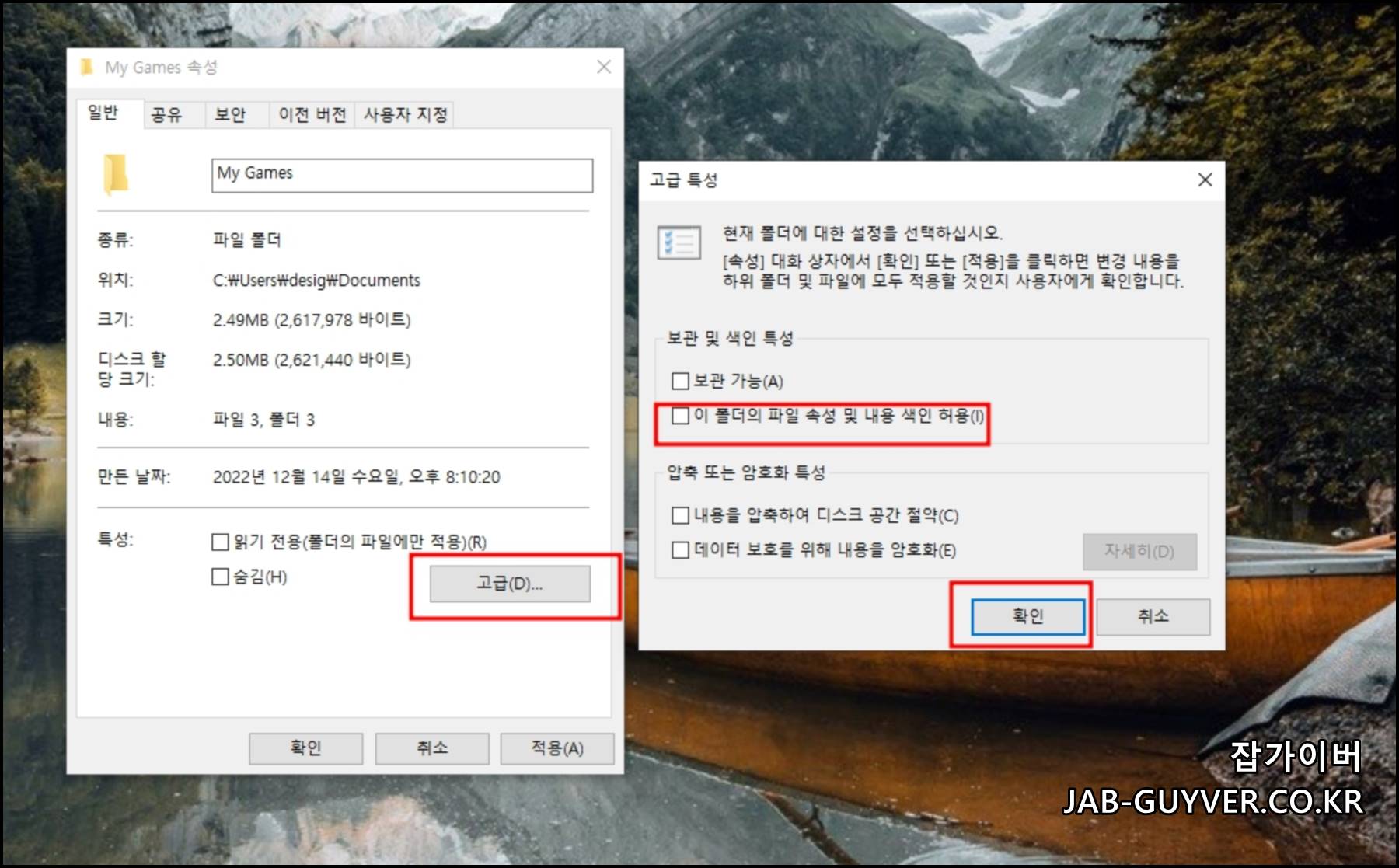 보안탭으로 들어가 게임저장폴더를 이 폴더의 파일 속성 및 내용 색인허용을 체크해제해줍니다.