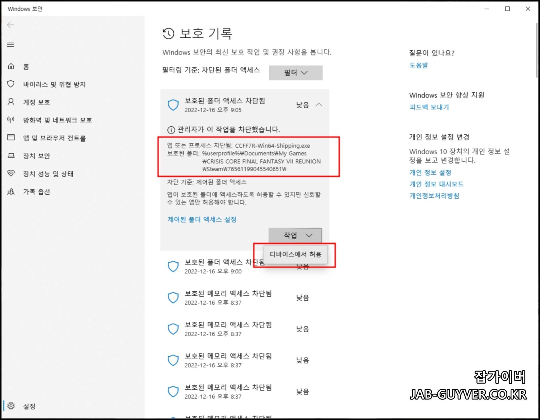 게임 저장이 안된다면 보호된 폴더 액세스 차단 된 내역을 확인하고 게임폴더라면 디바이스에서 허용을 체크해줍니다.