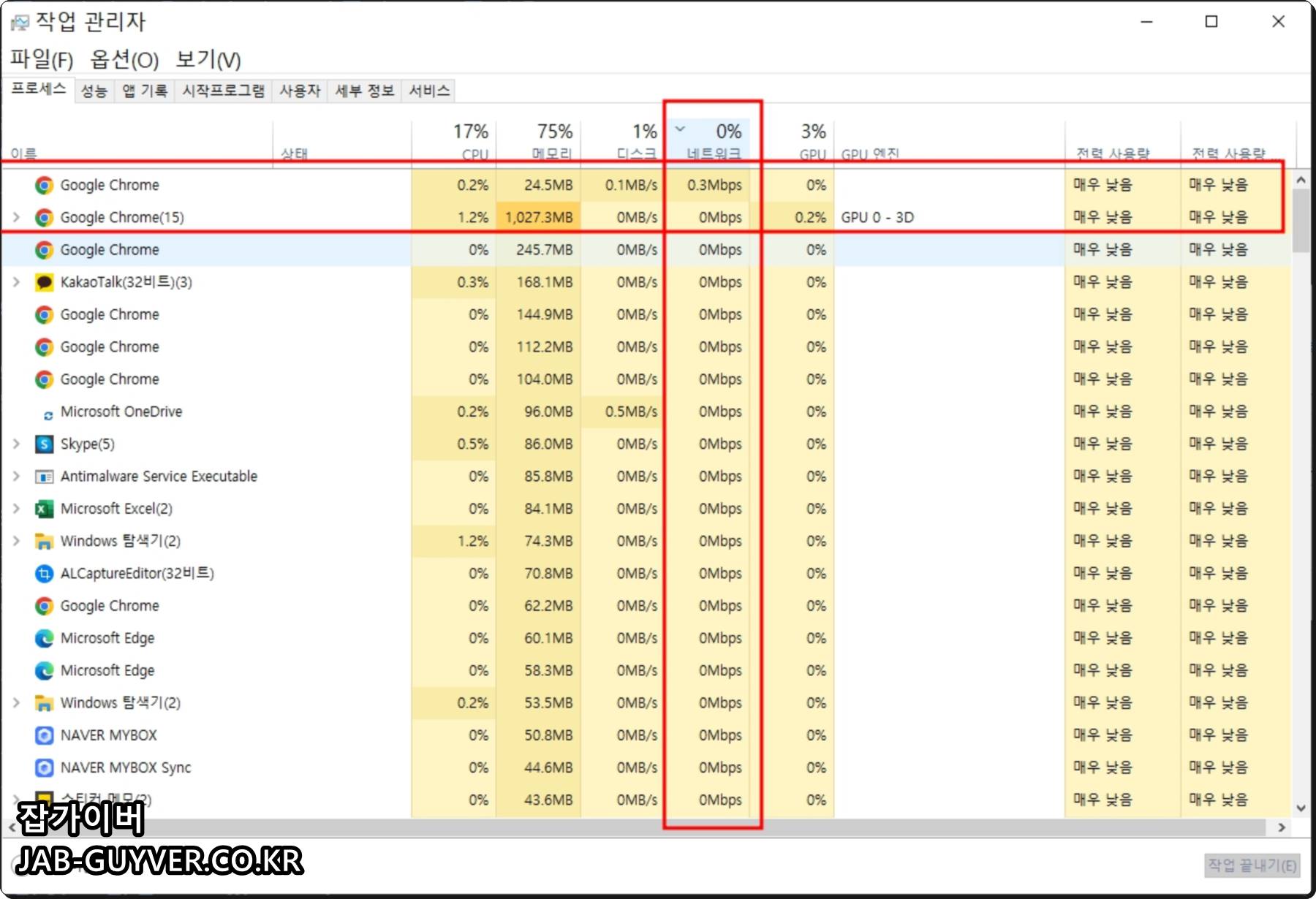 우선 작업관리자를 실행 후 네트워크 속도를 저하시키는 요소가 있는지 확인해봐도 네트워크 사용량은 거의 사용되지 않고 있습니다.