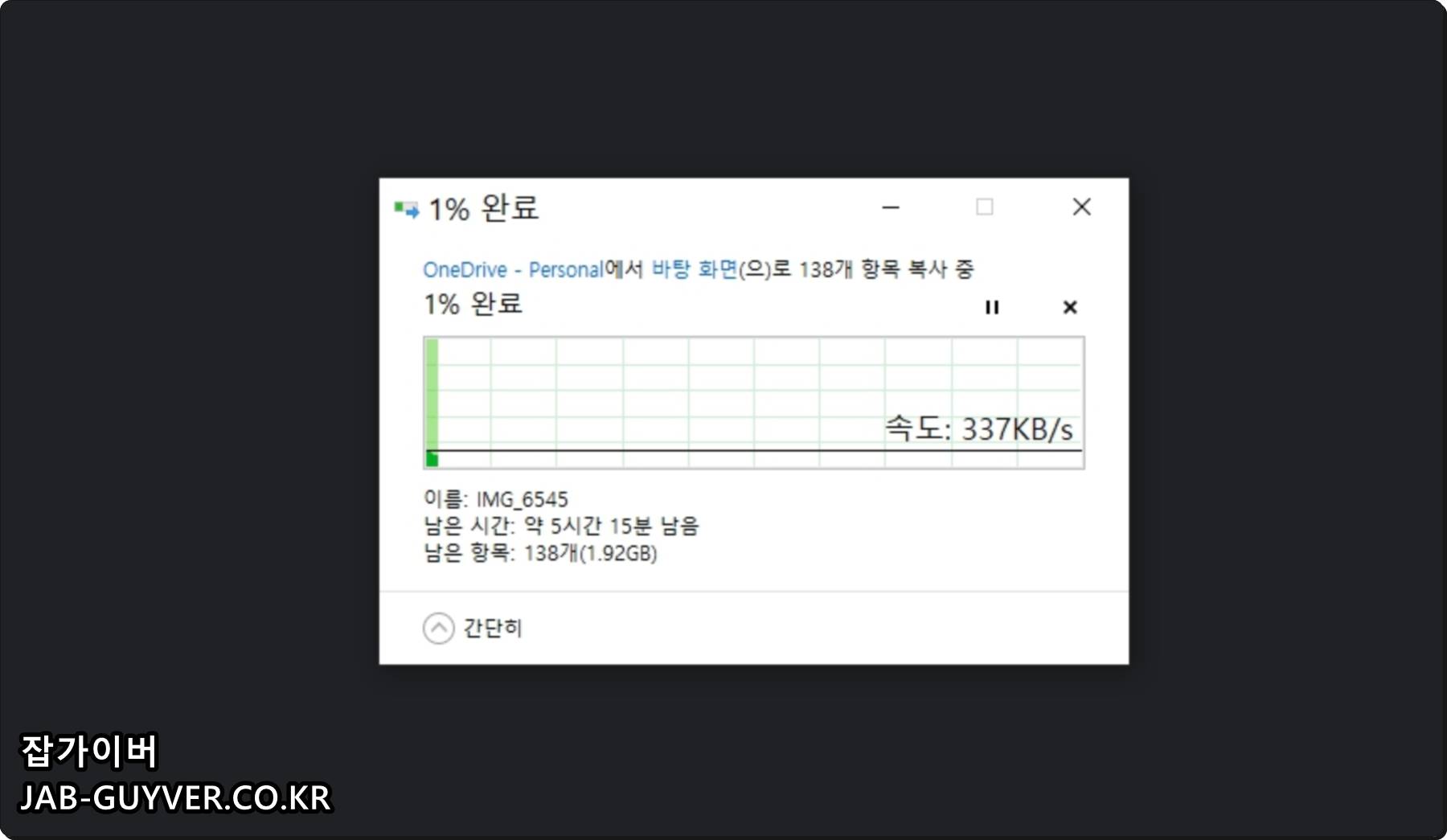현재 원드라이브에서 사진을 다운로드 받는데 1.92gb 약 138장의 사진을 다운로드 받는데 337kb/s 속도르 ㄹ보여주고 잇으며 무려 5시간 15분이나 시간이 남았다고합니다.