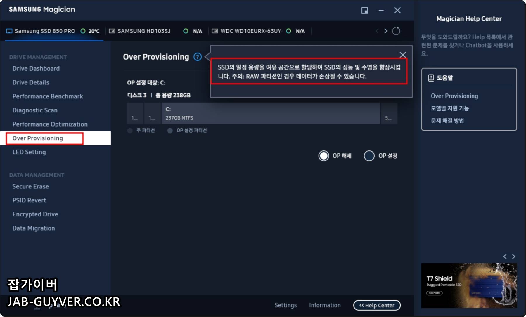 현재 삼성의 SSD 카드로 Samsung SD 850 PRO 256GB 사용하고 있으며 다른 SSD와 달리 삼성 SSD는 Samsung Magician "삼성 매지션"이라고 하는 성능설정 및 수명관리 그리고 데이터 마이그레이션을 위한 윈도우 마이그레이션 기능을 제공하고 있는데 기존에 사용하던 매지션 프로그램이 새롭게 업데이트 된걸 모르고 사용하다가 최근 다시 설치해 보았습니다.
