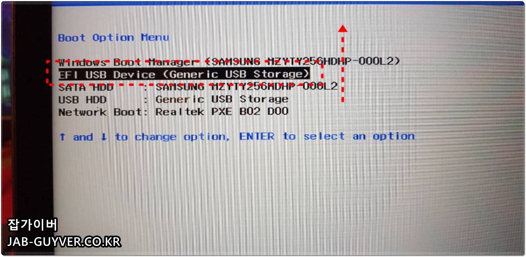 BIOS의 Boot Option Menu로 들어가면 윈도우 부트 매니저, SSD, HDD, USB, CD-ROM 등이 나열되어 있습니다. 여기서 USB 장치를 선택한 뒤 목록의 가장 위쪽으로 올려두면 이후에는 항상 USB로 먼저 부팅을 시도하게 됩니다.