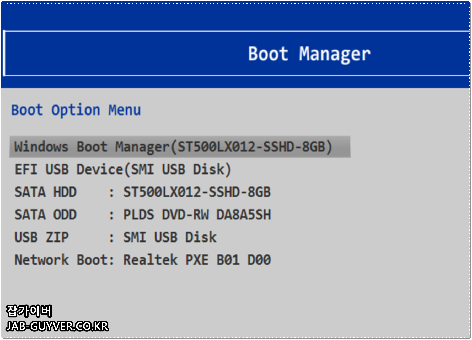 부팅 직후 F12 키를 연타하면 Boot Manager가 열리면서 한 번만 사용할 부팅 장치를 고를 수 있습니다. 여기서 USB 저장장치를 선택하면 곧바로 윈도우 USB 설치 화면으로 넘어갑니다.