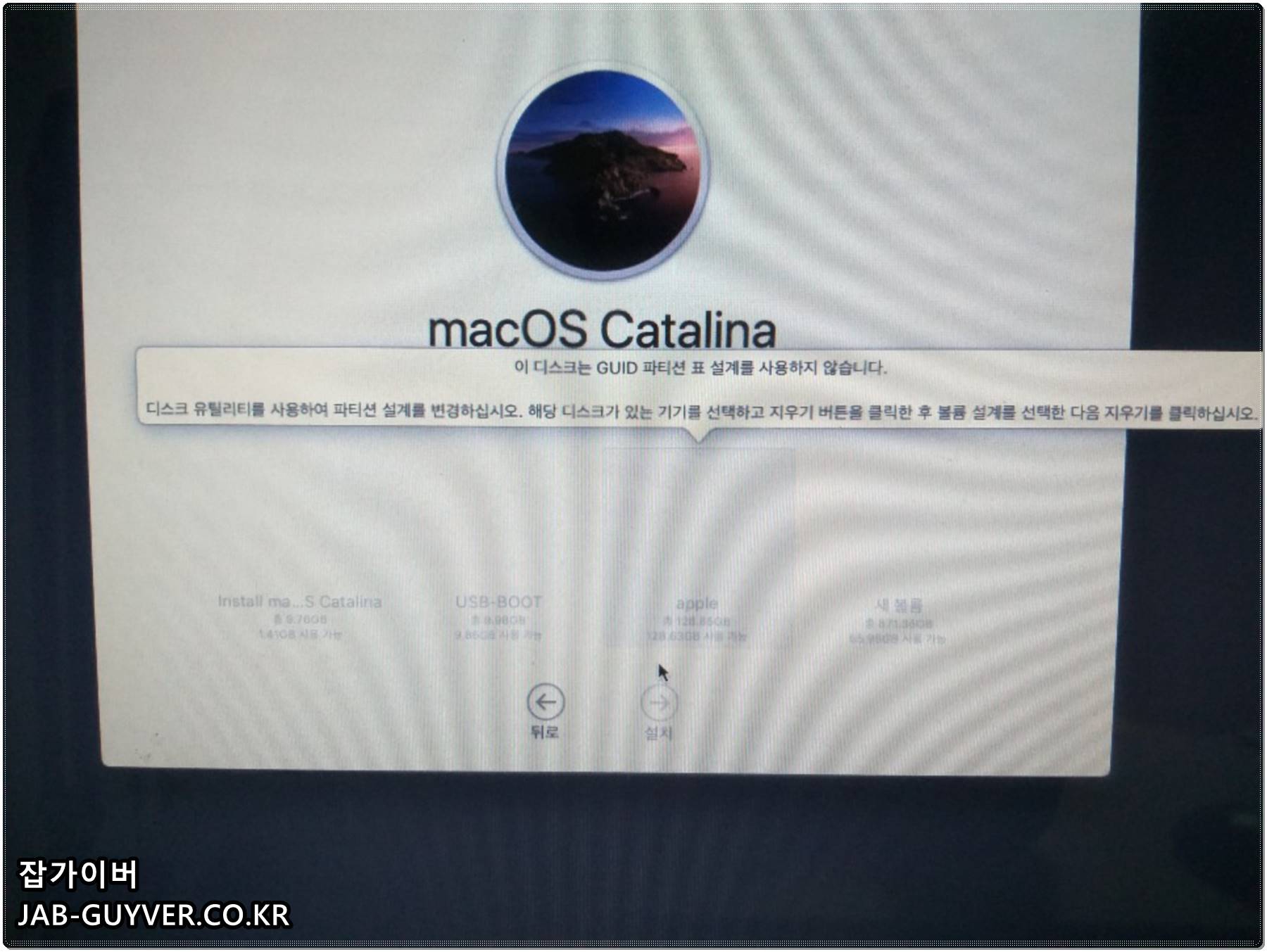 추가 구성요소가 잘 받아지지 않거나, 설치 화면에서 “이 디스크는 GUID 파티션 표를 설계하지 않습니다” 같은 문구가 보인다면, macOS가 기대하는 방식과 다른 파티션 구조로 디스크가 잡혀 있을 가능성이 큽니다.