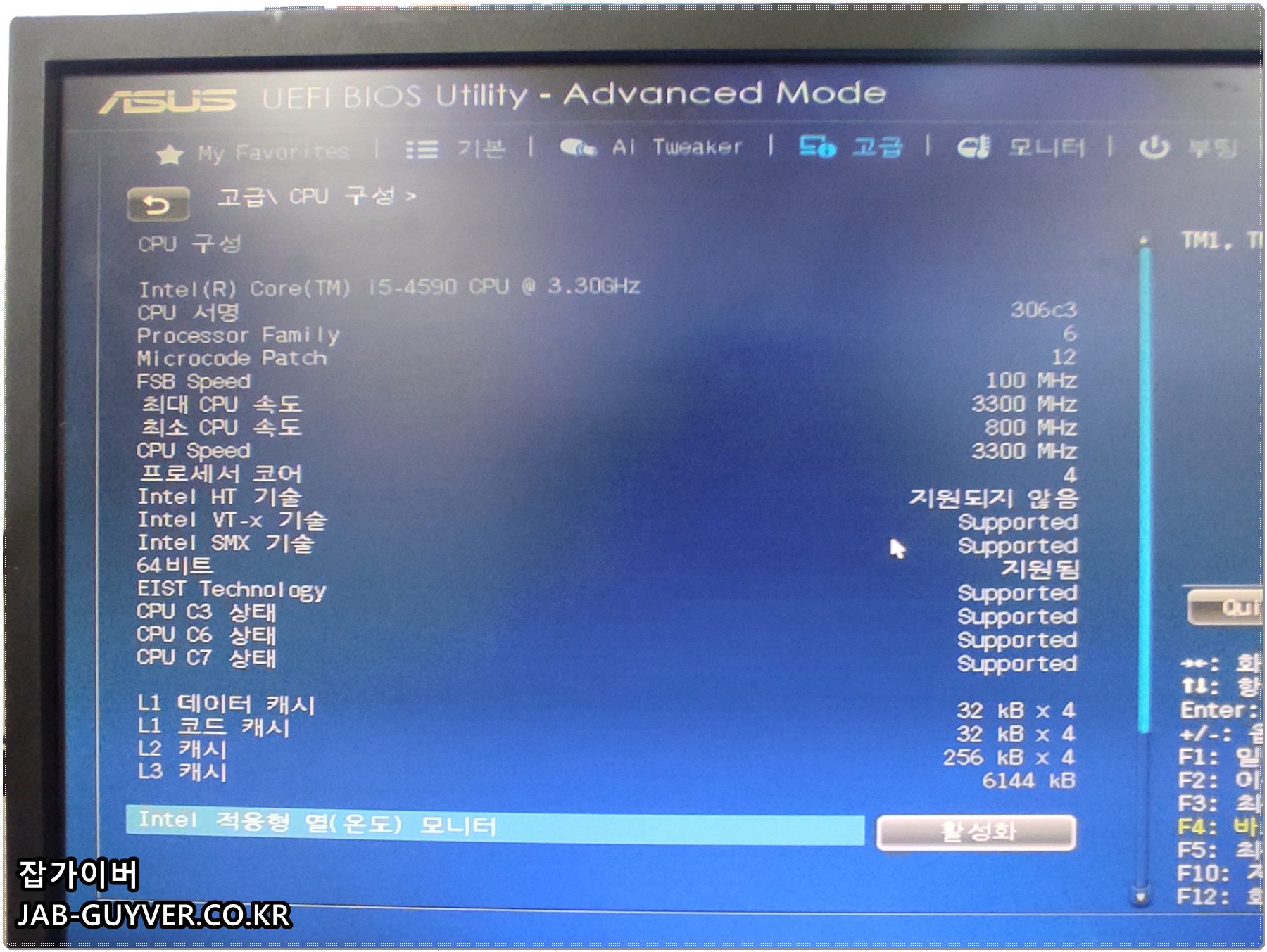 아수스 메인보드의 고급설정으로 각각의 하드웨어를 설정을 변경할 수 있습니다.