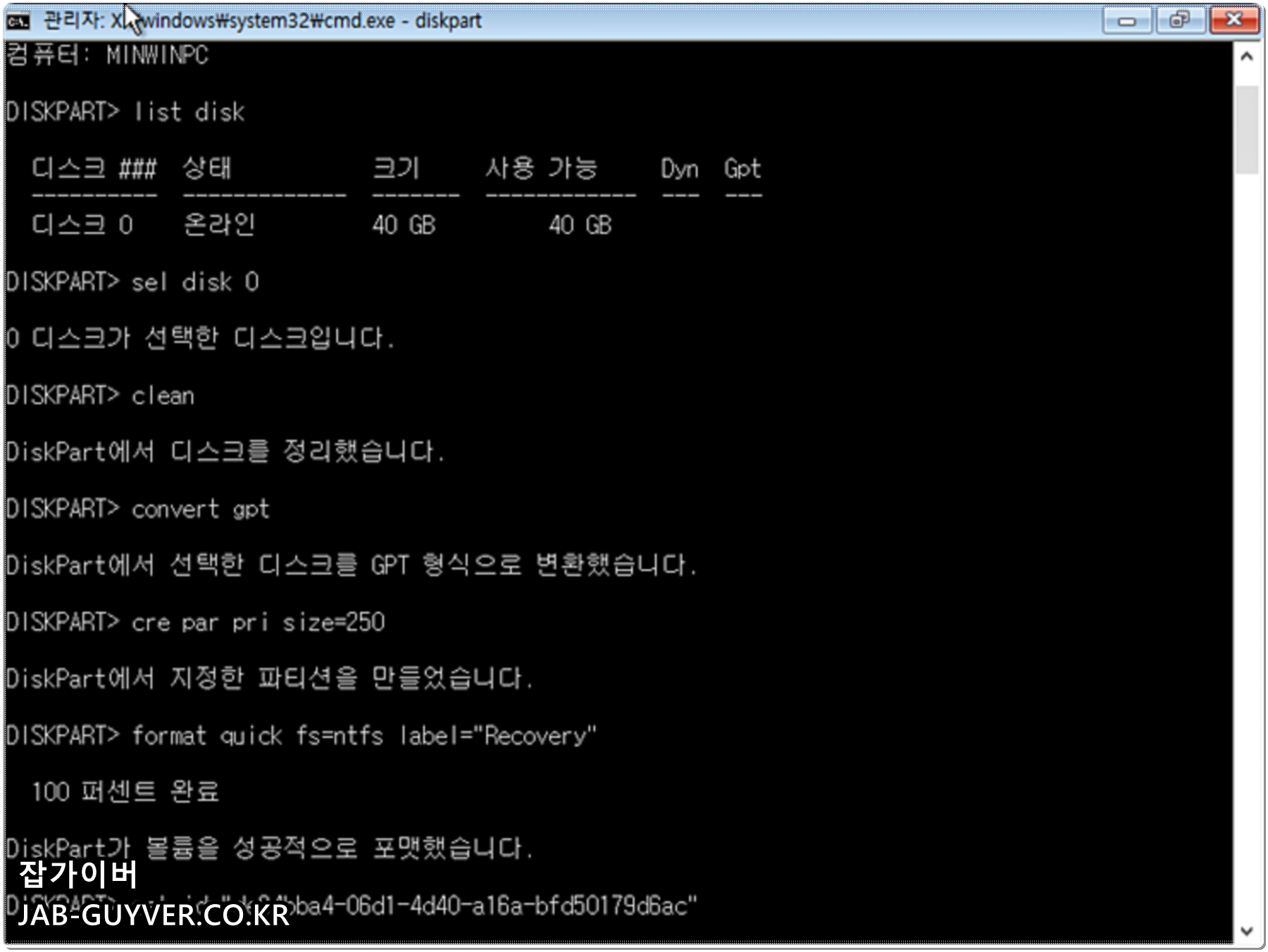 윈도우10 UEFI 복구파티션 삭제 MBR 에러 GPT 초기화
