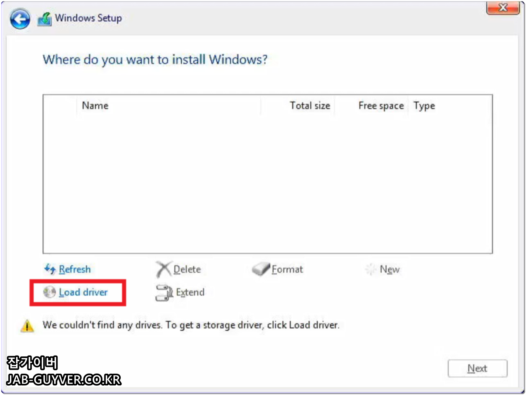 Load Driver (드라이브 로드)를 눌러 아까 USB 부팅디스크에 넣은 인텔 IRST 폴더를 지정해주면 설치할 파티션이 활성화됩니다.