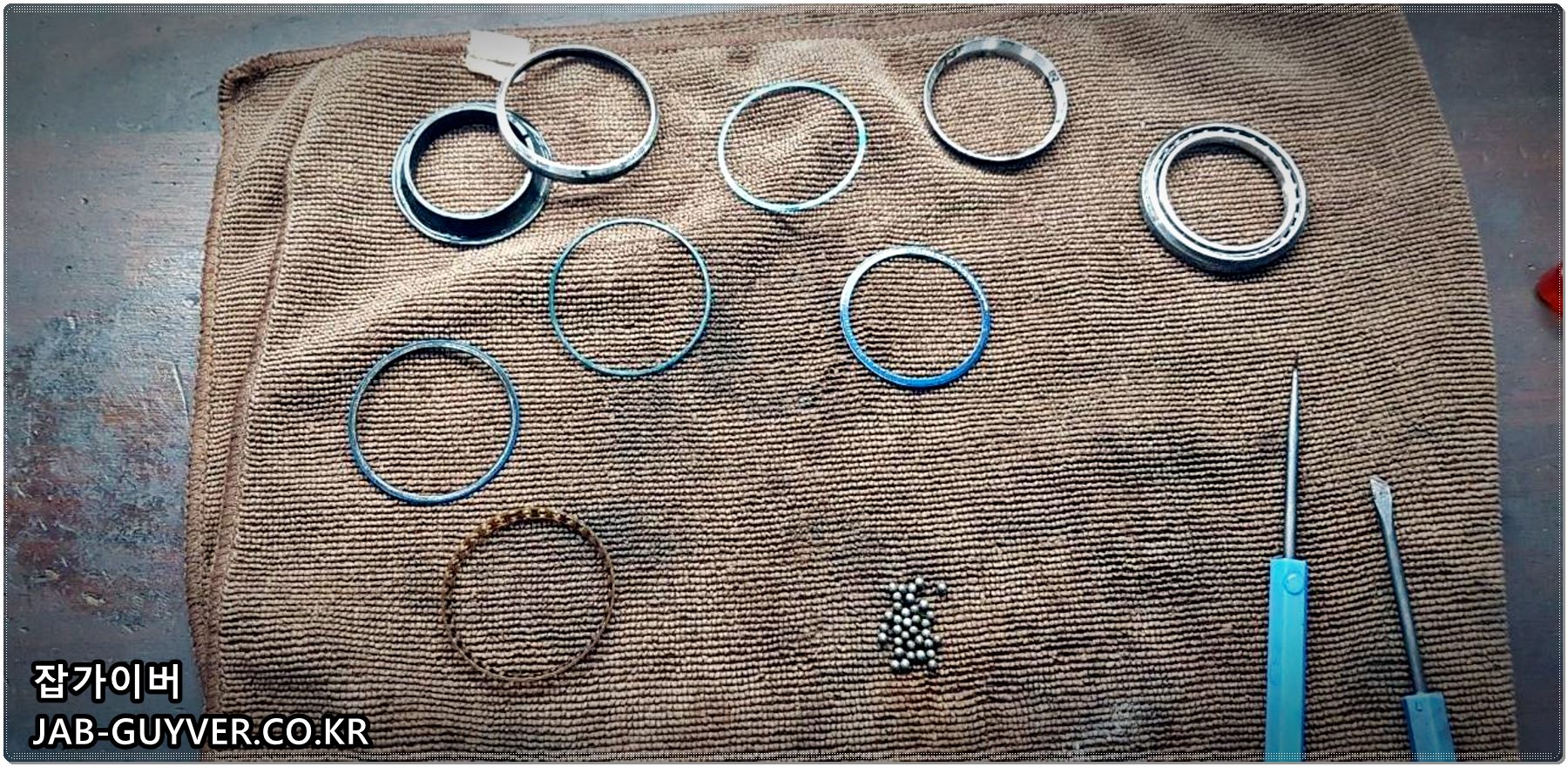 자전거 베어링으로 바퀴 타이어 허브 베어링이나 크랭크 페달 베어링 외에도 우중라이딩을 자주하거나 물세차를 한다면 포크 쪽 헤드튜브 베어링도 정비를 해주세요..