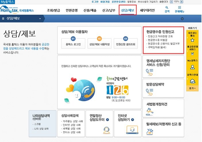 전자신고 : 홈택스> 상담/제보 > 현금영수증 민원신고