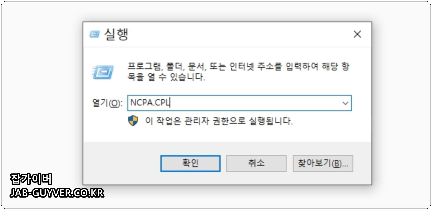 윈도우 키 + R을 눌러 실행창에 아래 명령어를 입력합니다.