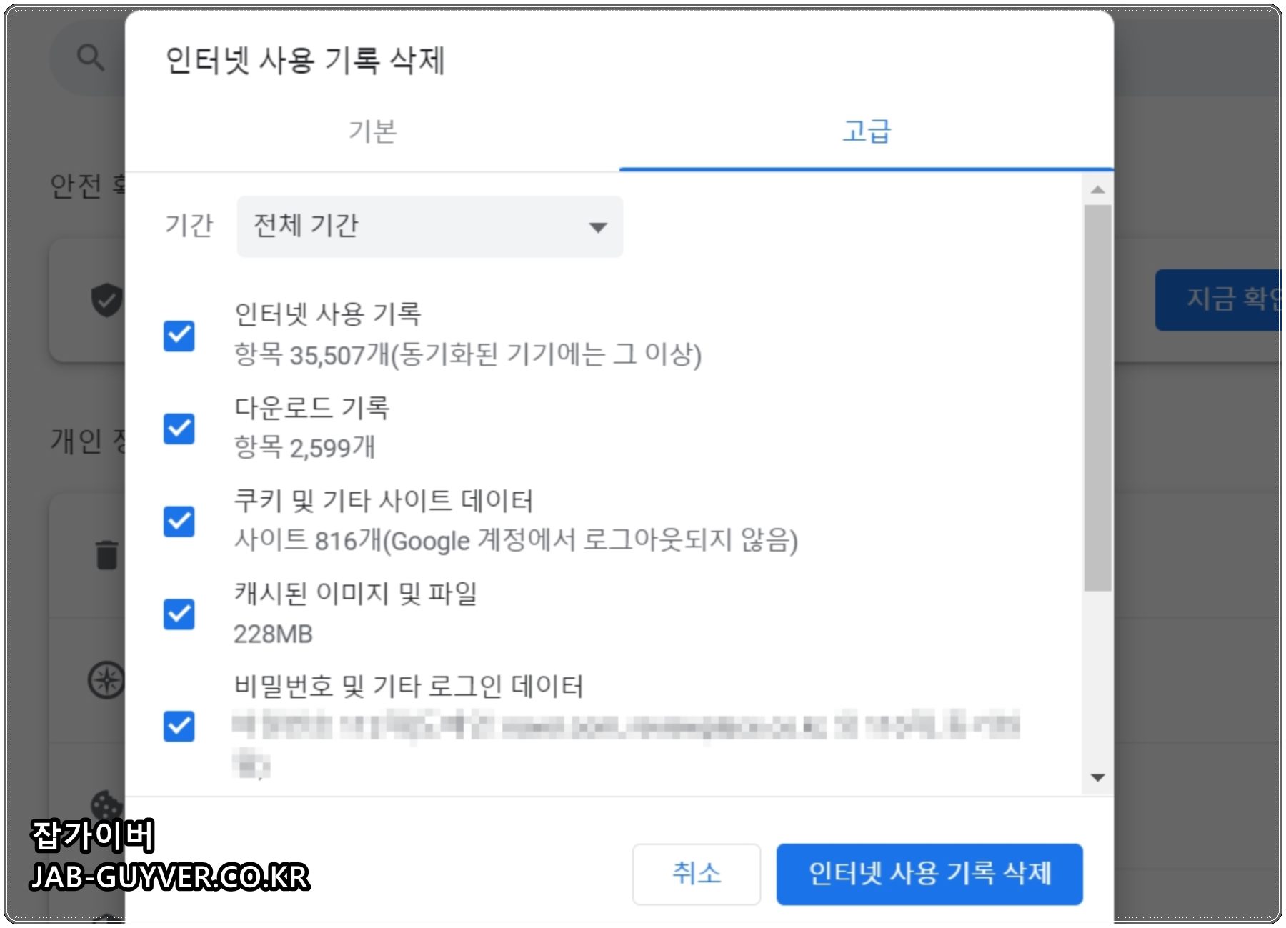 인터넷 사용기록 삭제를 통해 아래 항목을 모두 삭제합니다.