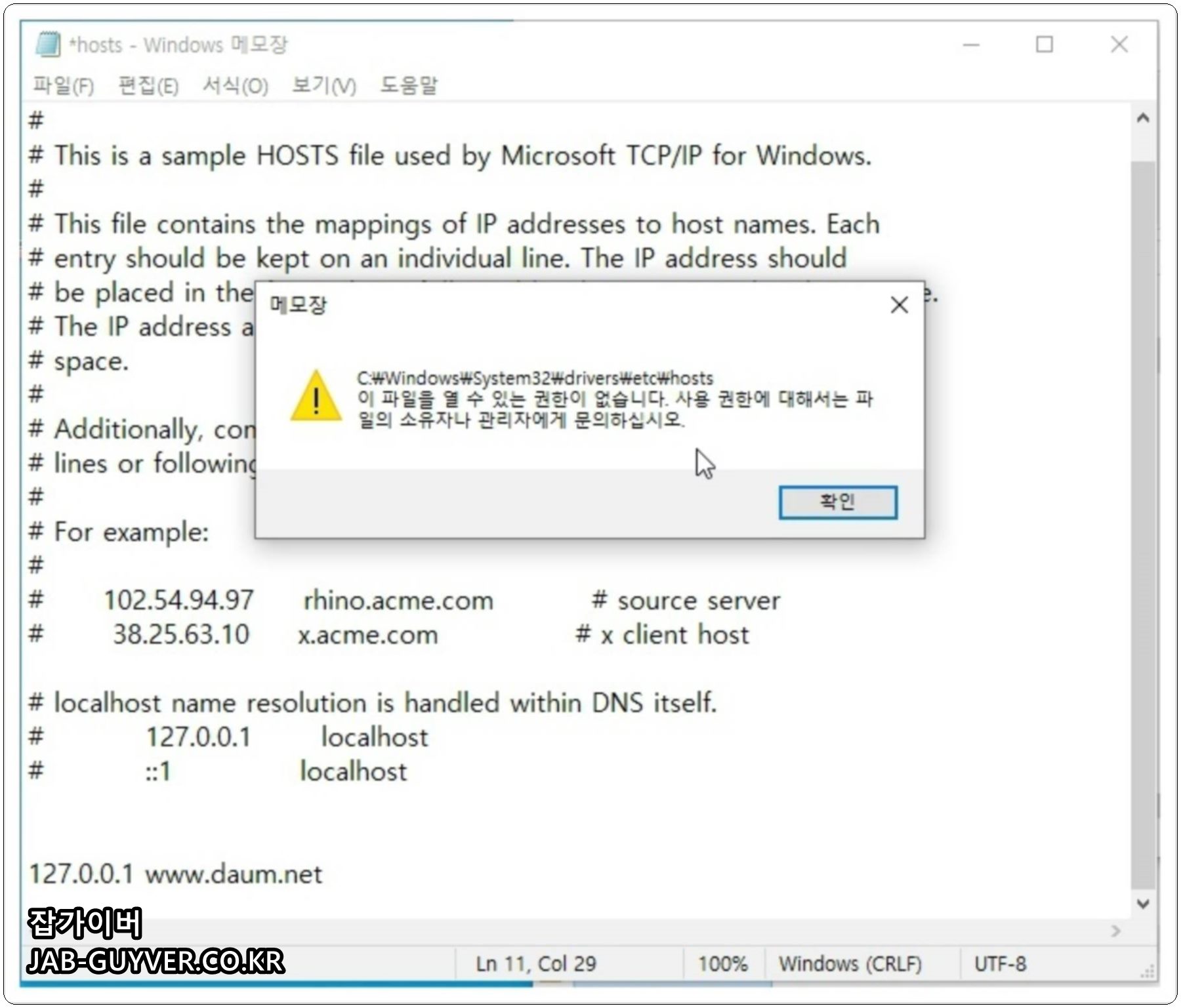 Hosts 파일 권한 문제 때문에 수정이 되지 않는다면, 관리자 권한으로 메모장을 실행한 뒤 파일을 여는 방식으로 접근하면 된다. 조직 정책에 따라 권한이 막혀 있는 경우엔 IT 담당자에게 요청해서 변경하는 것이 안전하다.