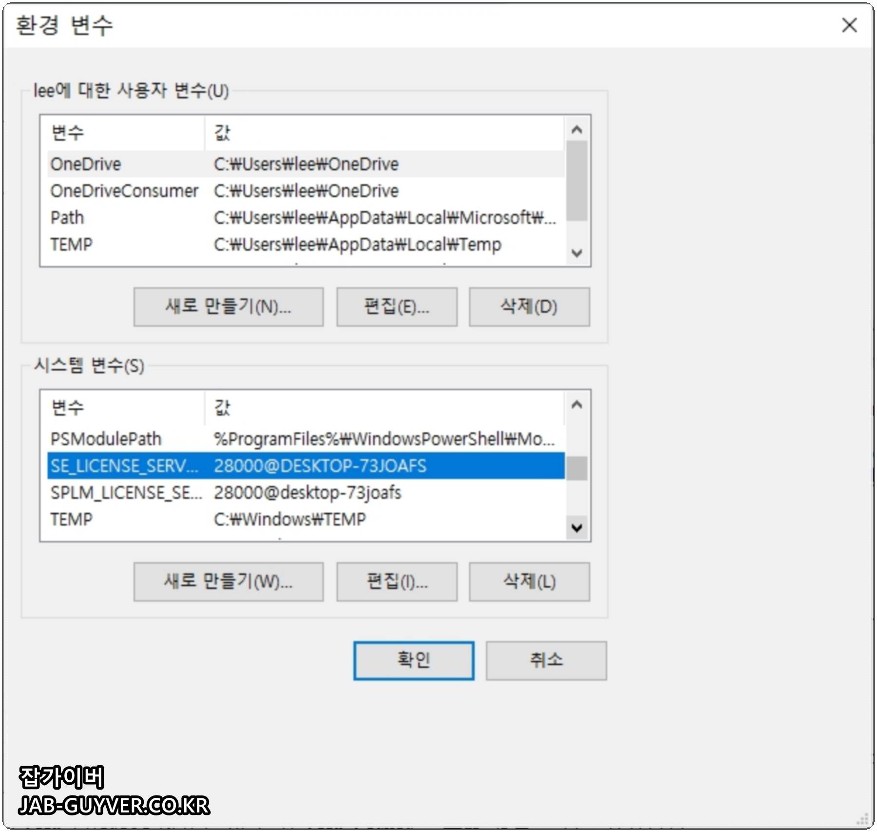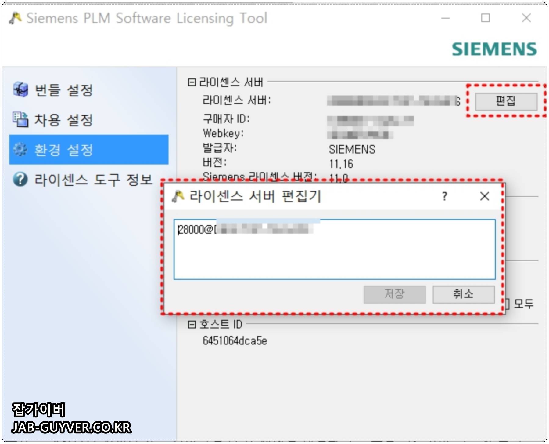 NX 라이센스 번들에서 라이센스 서버 편집기에도 28000@포트가 윈도우 환경변수와 동일하게 변경되어 있는지도 확인합니다.