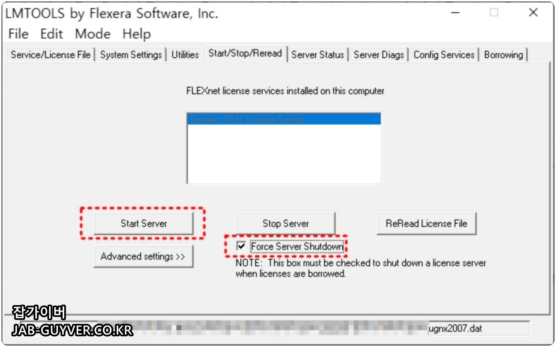Lmtools를 실행해서 라이센스 파일을 다시 불러와 제대로 된 Host 정보인지 확인하고 라이센스 서버를 재시작합니다.