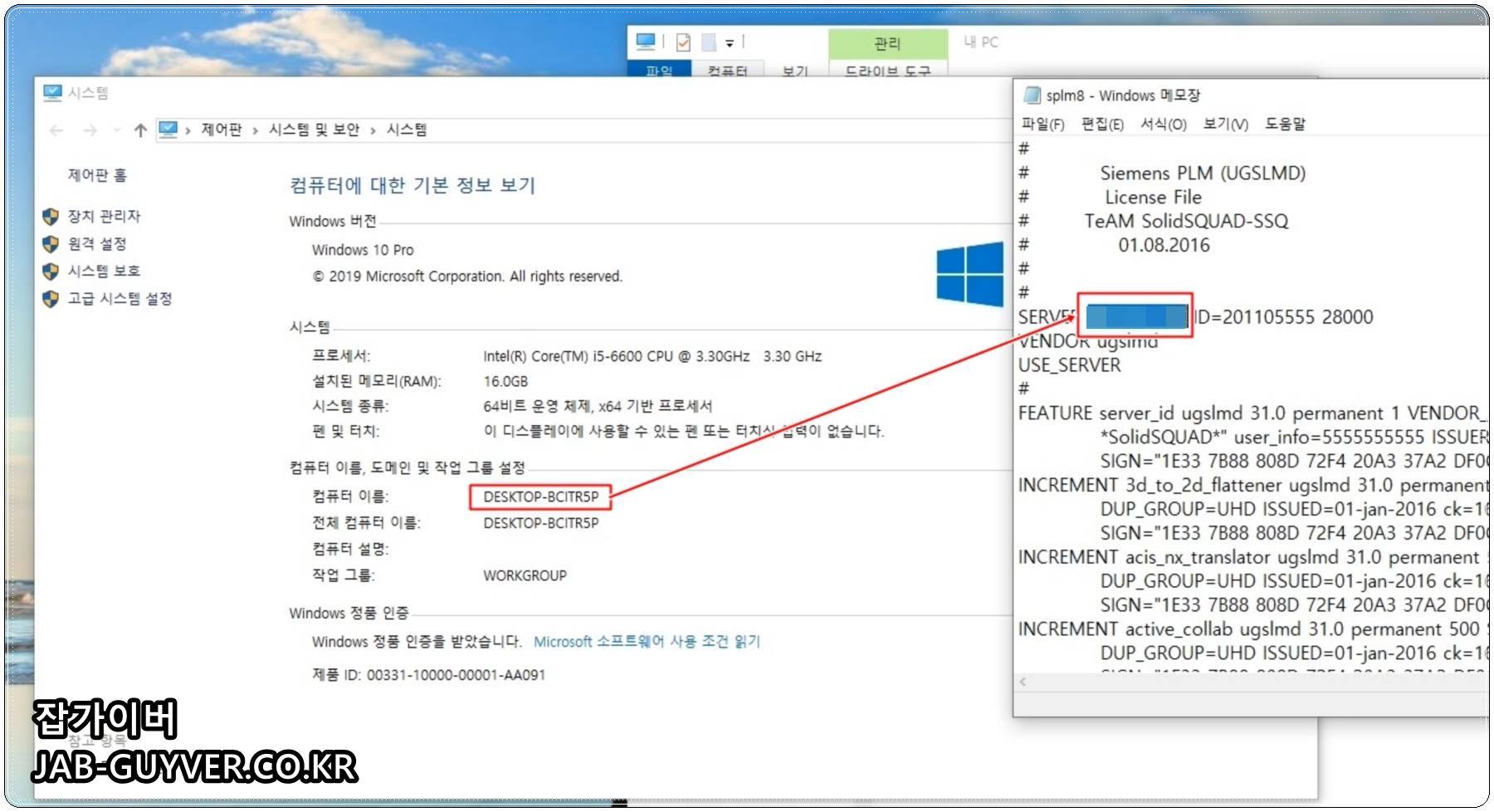 이 경우에는 윈도우 컴퓨터 이름을 영문과 숫자 조합으로 바꾸고, 라이선스 파일의 SERVER 줄도 같은 이름으로 맞춰주면 됩니다.