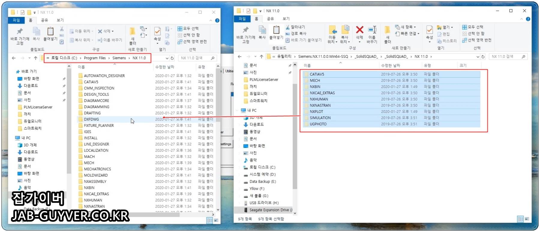 NX 설치폴더에 있는 크랙파일 _SolidSQUAD 폴더를 NX가 설치된 경로에 각각 2군대 넣어야 합니다.