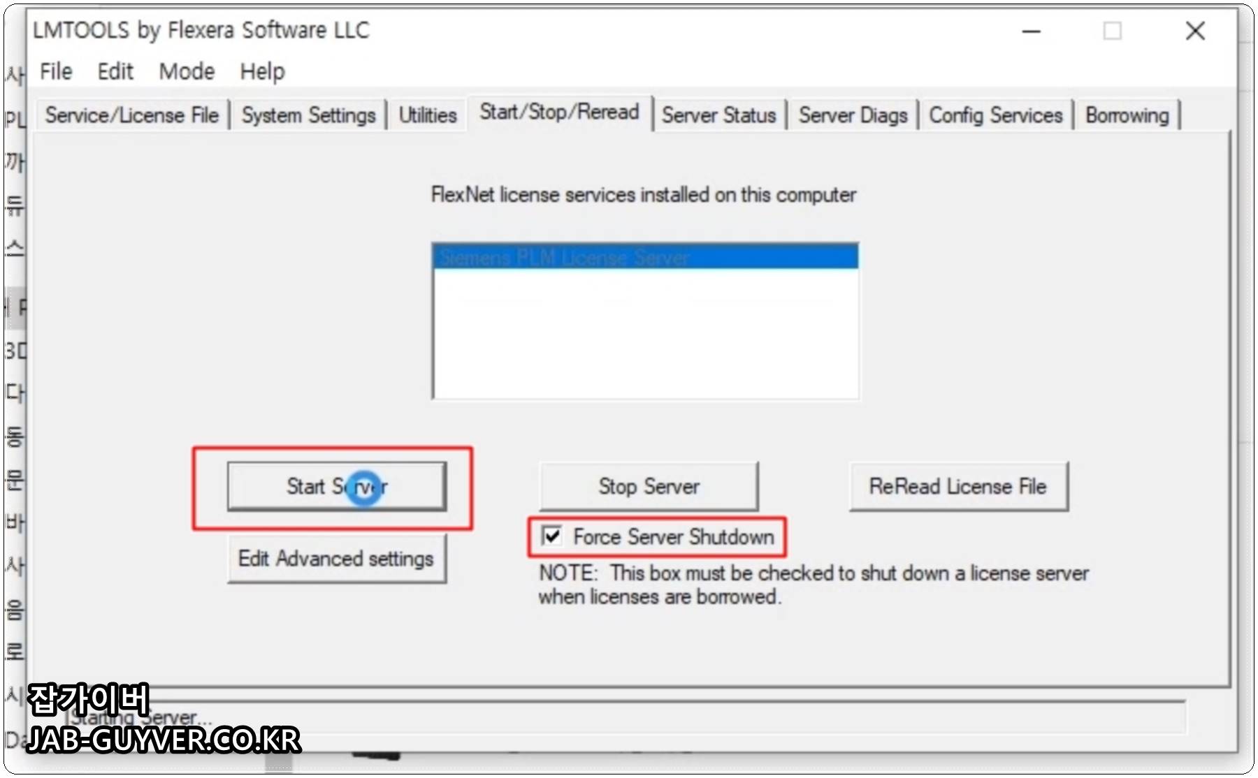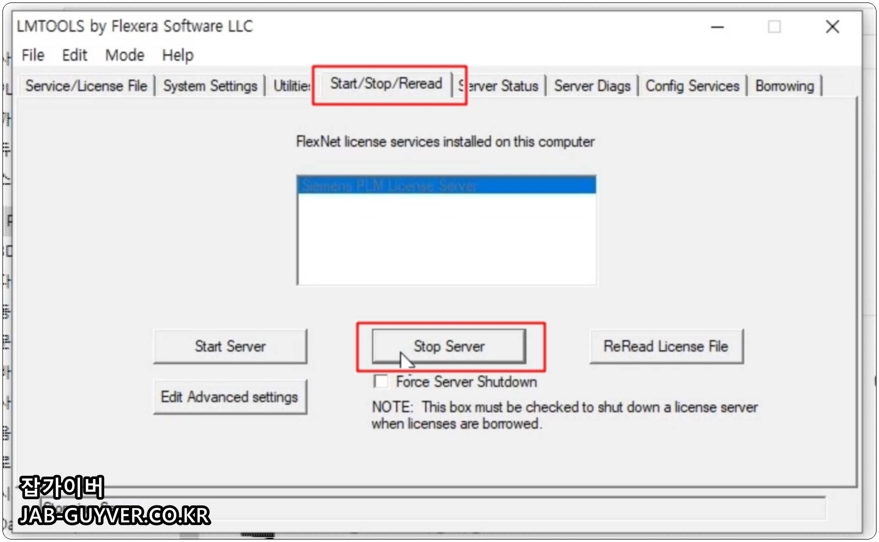 Start / Stop / Reread 탭으로 이동해서 Stop Server 버튼을 눌러 라이선스 서버를 한 번 꺼 줍니다. 이후 라이선스 파일 수정이나 교체 작업이 끝난 뒤 Start Server를 눌러 다시 올리면 됩니다.