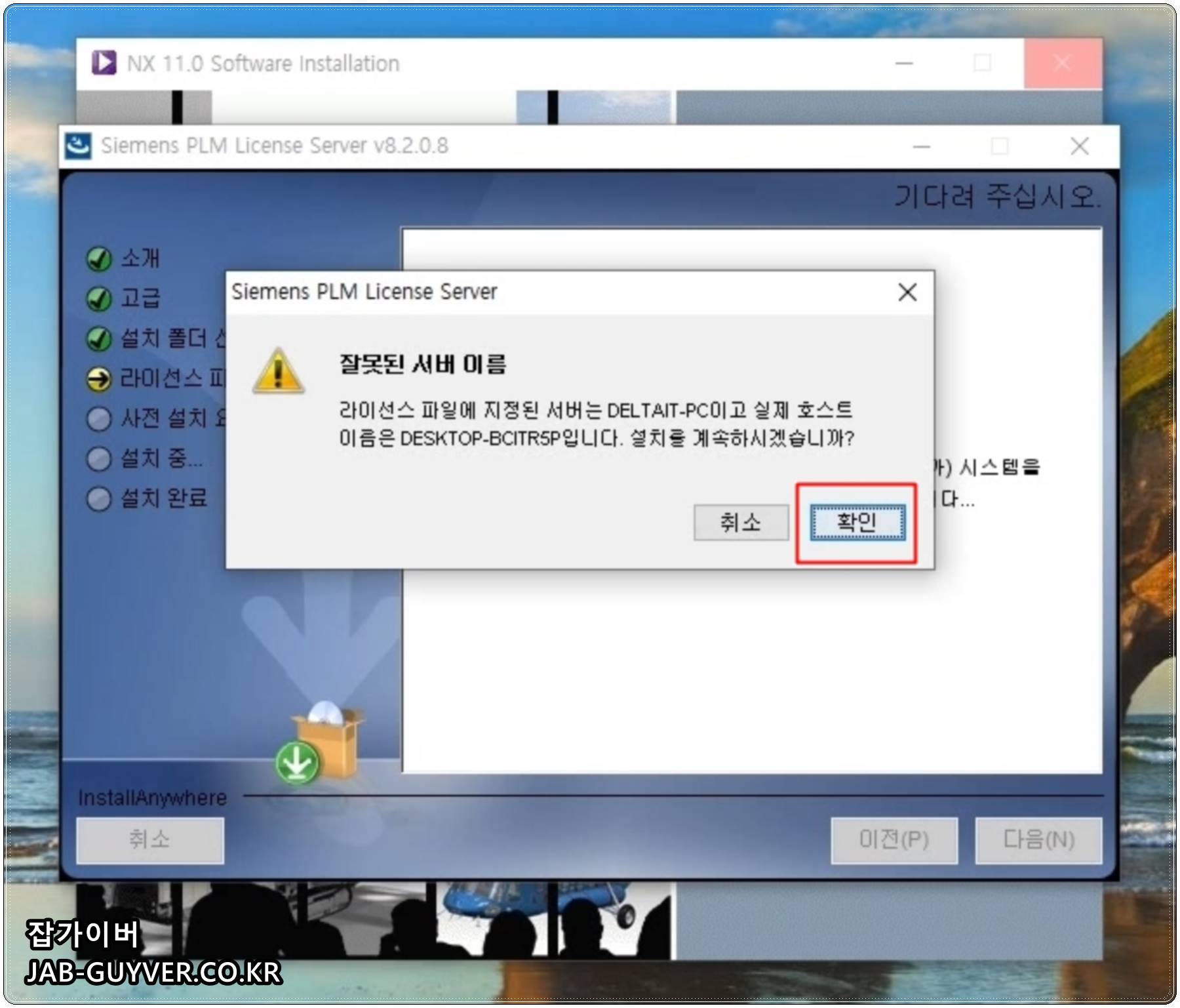 잘못된 서버이름이라고 나온다면 라이센스 파일에 있는 Host Name이 컴퓨터 사용자이름 잘못 등록된 경우이거나 PC이름이 한글인 경우로 사용자이름을 영문으로 변경한 뒤 라이센스 파일에 등록합니다.