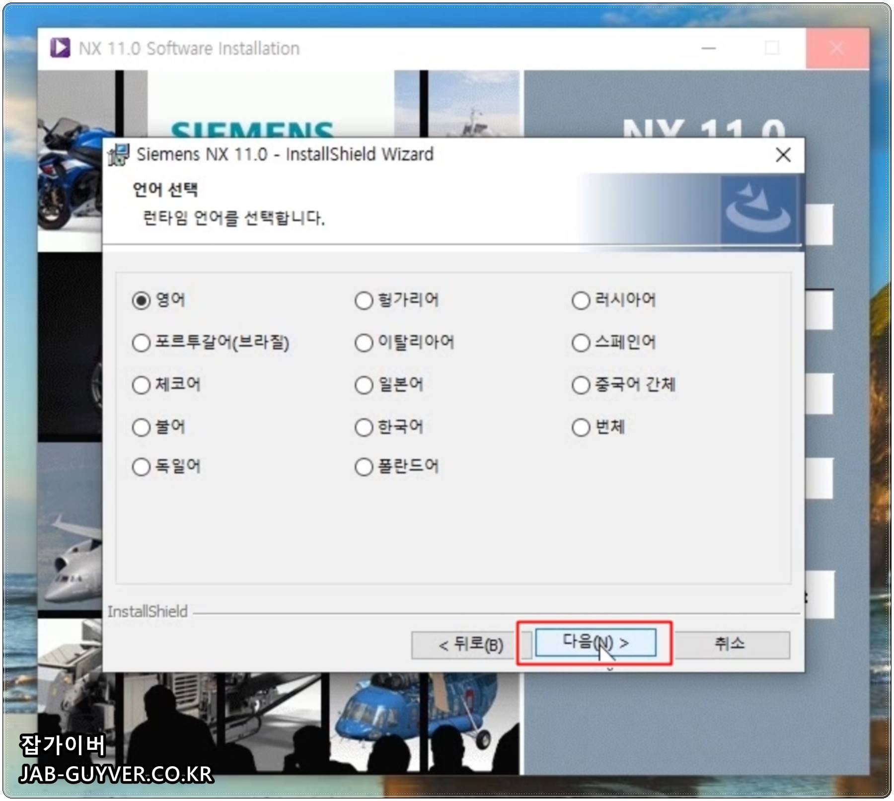 영어, 헝가리어, 러시아어, 포르투갈어 (브라질), 이탈리아어, 스페인어, 체코어, 일본어, 중국어 간체, 불어, 한국어, 번체, 독일어, 폴란드어 중 선택하며 이후 언어를 변경하고 싶다면 윈도우 환경변수를 통해 UGII_LANG 매개변수를 변경합니다.