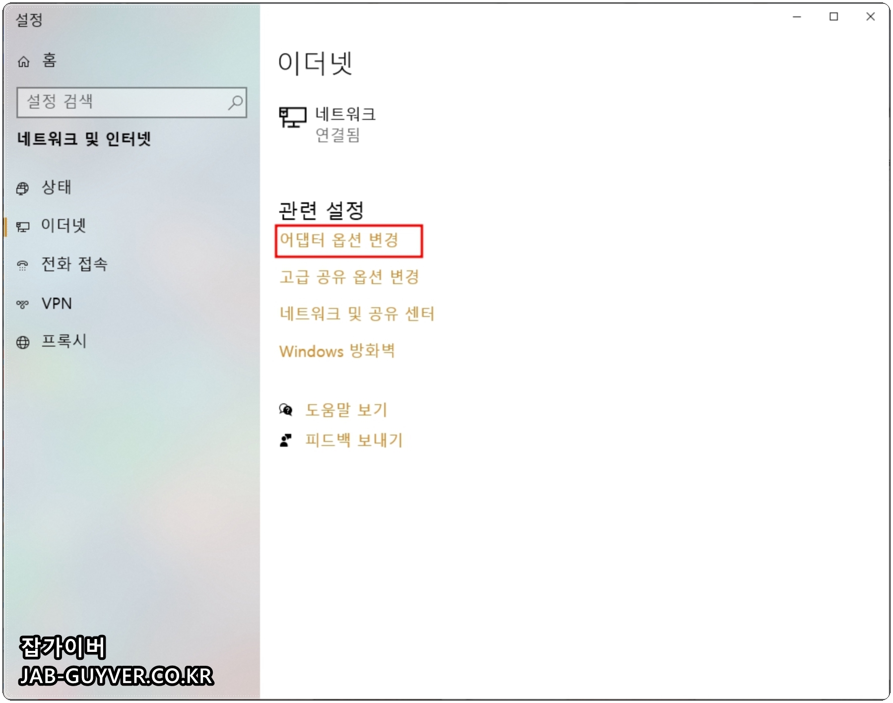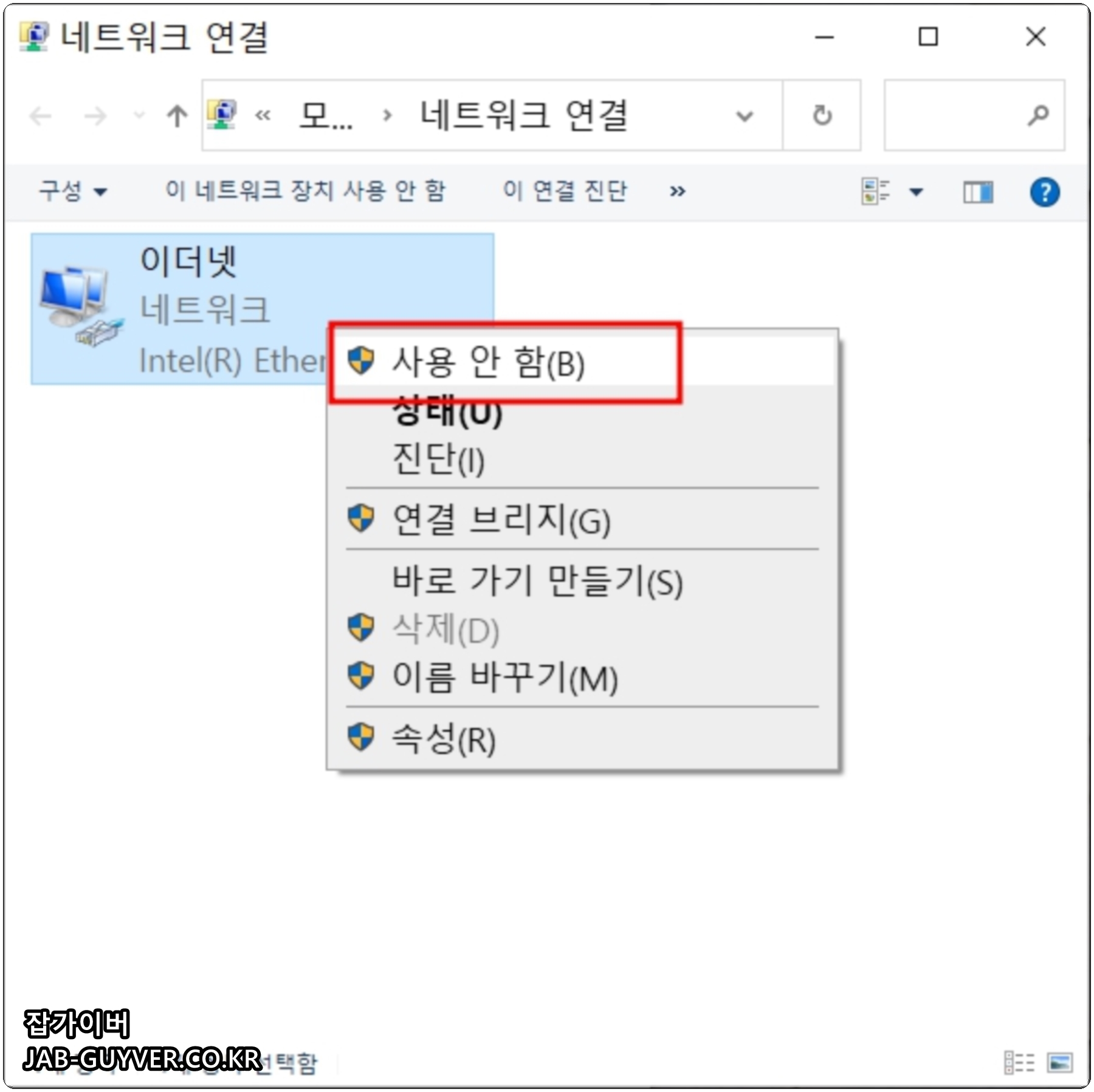 만약 인터넷 공유기 설치 후 인터넷이 안된다면 이더넷 - 어댑터 옵션 변경 -> 이더넷 연결 시 랜카드 드라이브가 여러개인지 확인하고 그 중 인터넷 활성화되어 있는지 확인합니다.