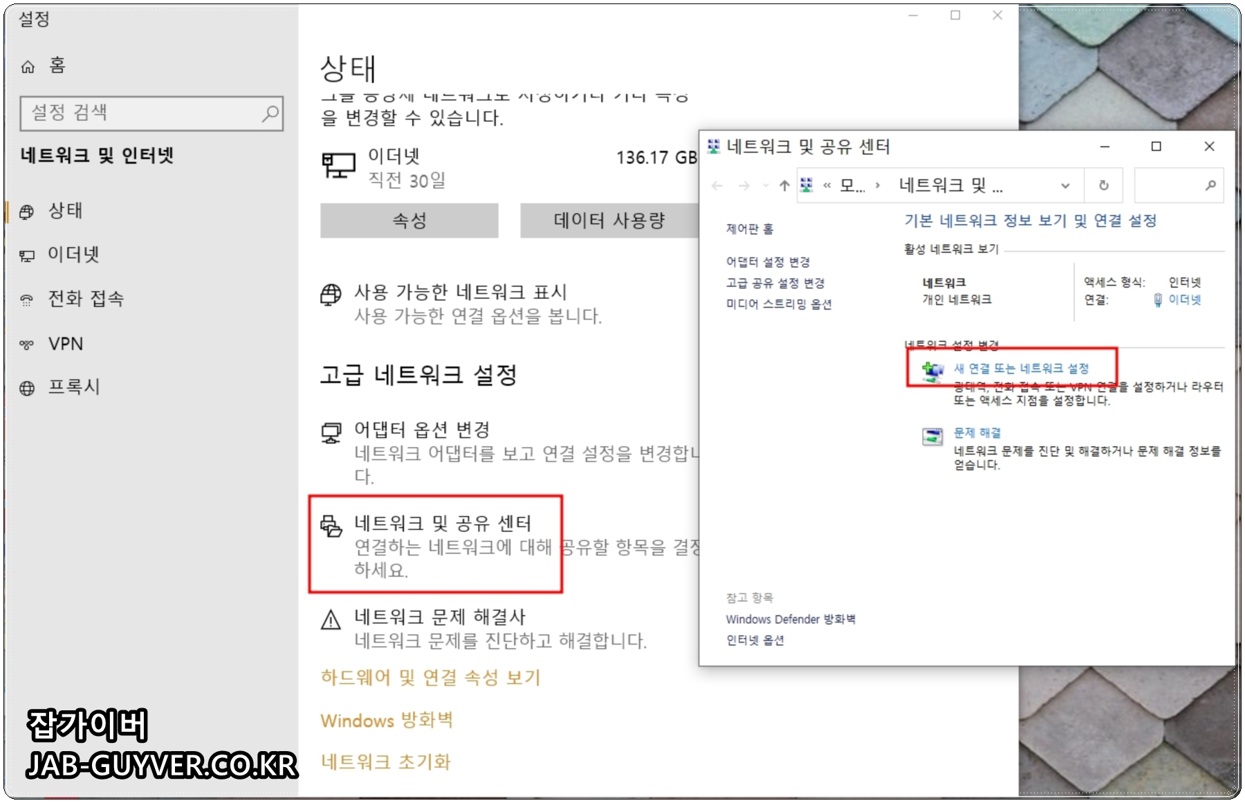 공유기 설치 후 인터넷이 계속 안된다면 고급 네트워크 설정 -> 네트워크 및 공유 설정에서 새 연결 또는 네트워크 설정을 선택합니다.