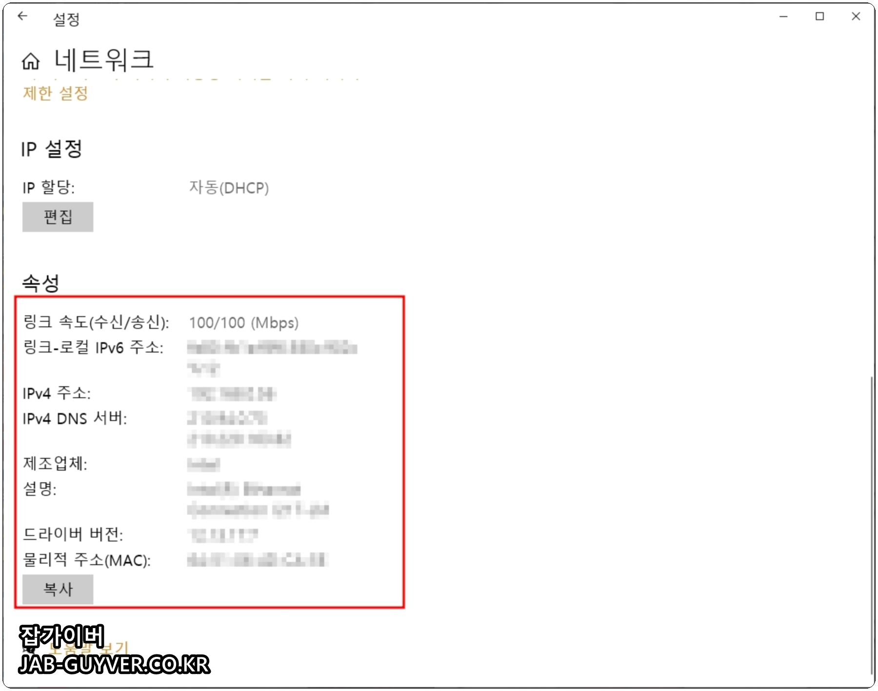 네트워크 설정으로 들어가면 현재 인터넷 수신 및 송신 인터넷 속도를 확인할 수 있으며 IPv6 주소 및 IPv4 주소 등 IP주소와 DNS 서버 주소, 공유기 제조사, 드라이브버전, 물리적 주소 (MacAdress)를 확인할 수 있습니다.