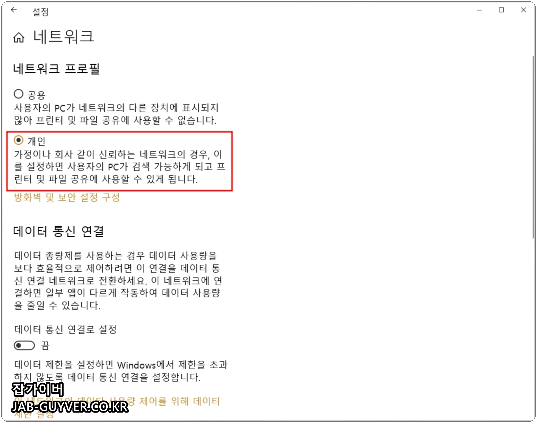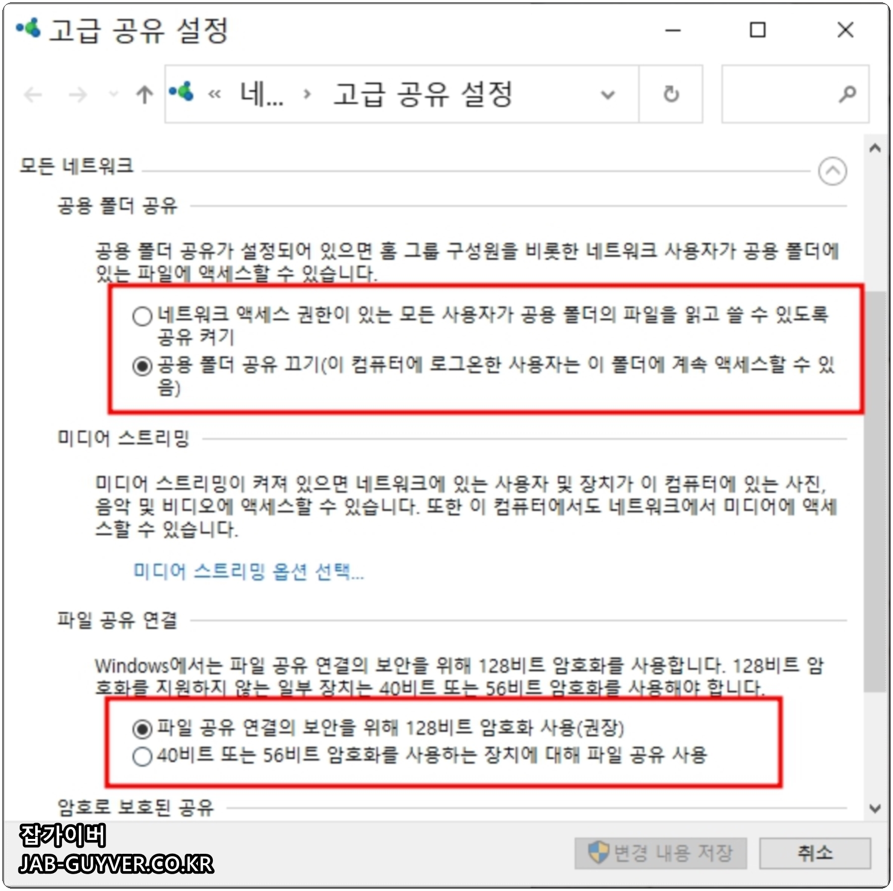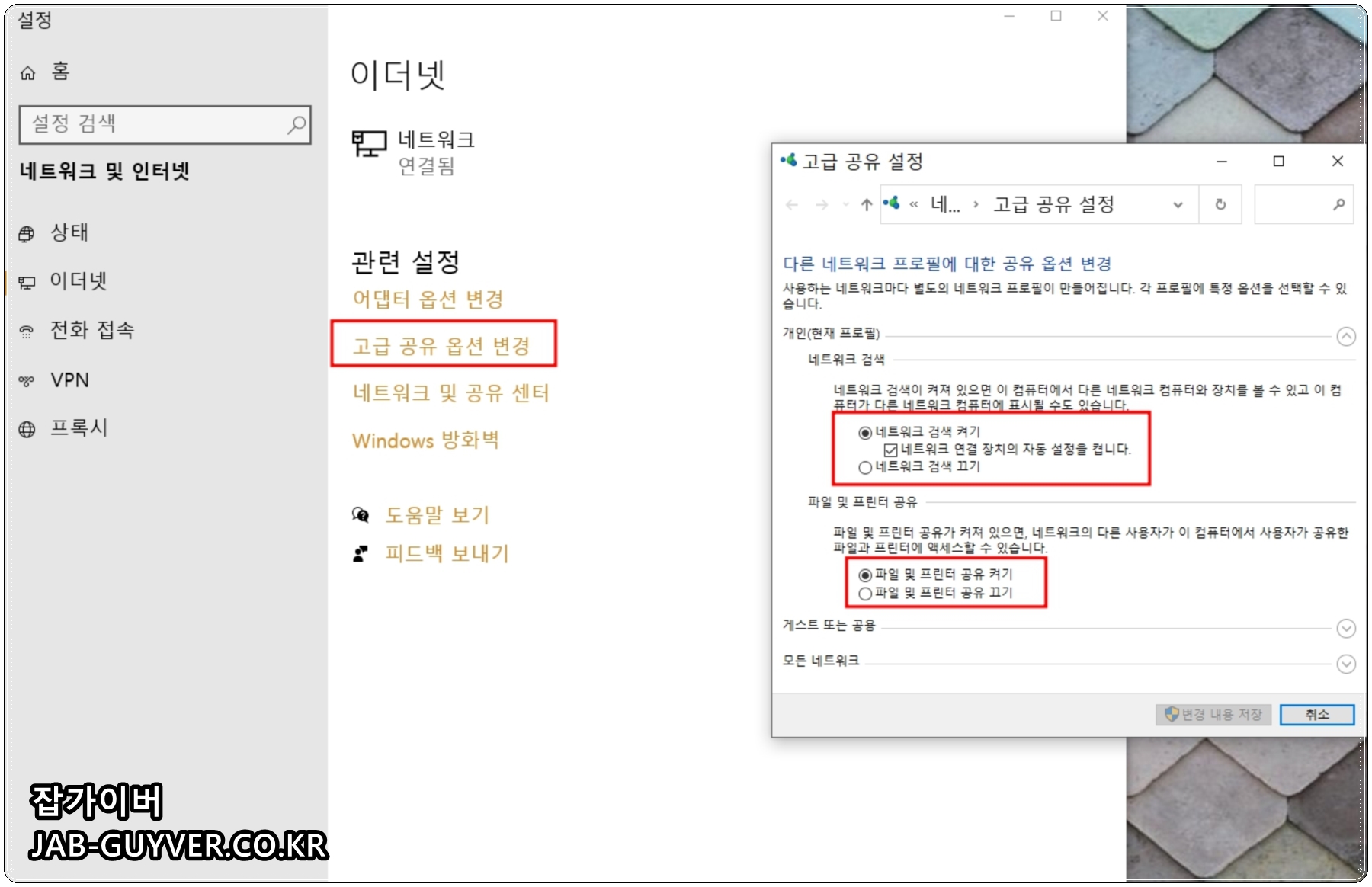 고급 공유 옵션으로 들어가면 네트워크 검색 및 파일 및 프린터 공유를 끄거나 킬 수 있습니다.