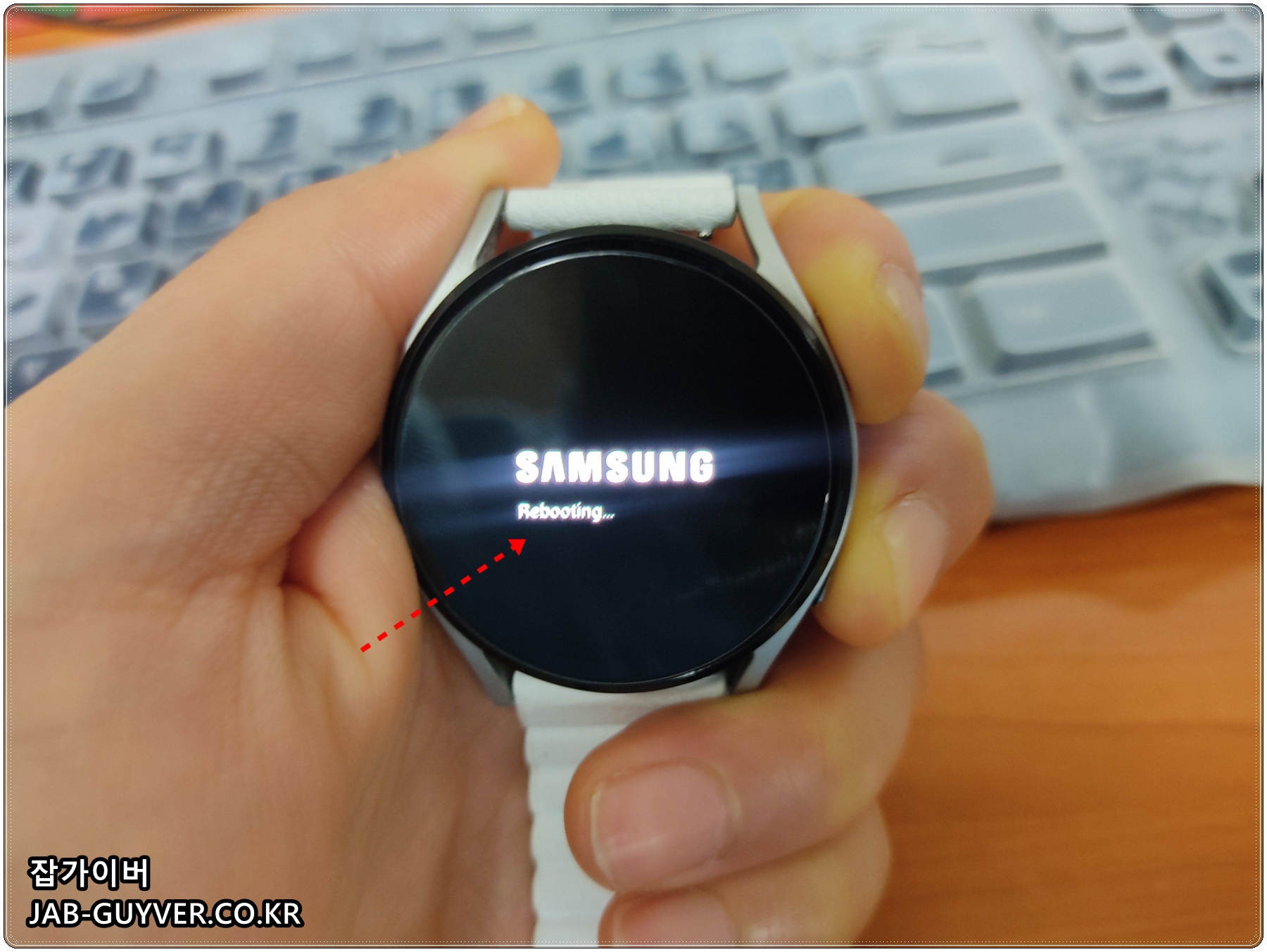 갤럭시워치 전원이 꺼져있는 상태에서 갤럭시워치5 부팅 중 Samsung 로고 밑에 Rebooting 로고가 실행되는데 이때 빠르게 상단버튼 2번 눌러줍니다.