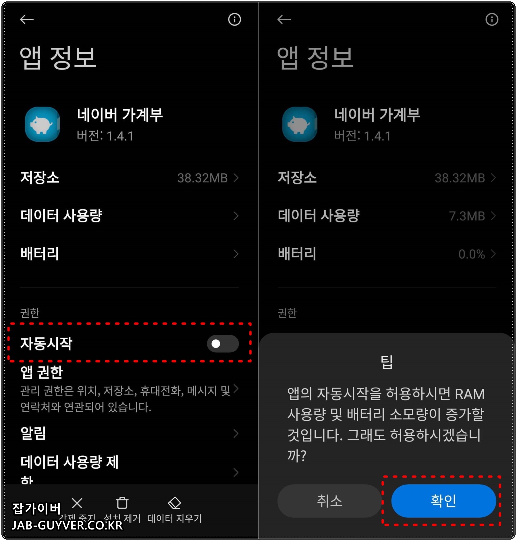 그럼 자동시작이 꺼져있는걸 볼 수 있는데 앱을 실행할때만 시작되고 자동으로 실행되지 않기 때문에 핸드폰결제 등의 경우 앱이 저절로 실행되지 않고 차단된것으로 네이버가계부 같은경우는 자동시작을 켜줍니다.