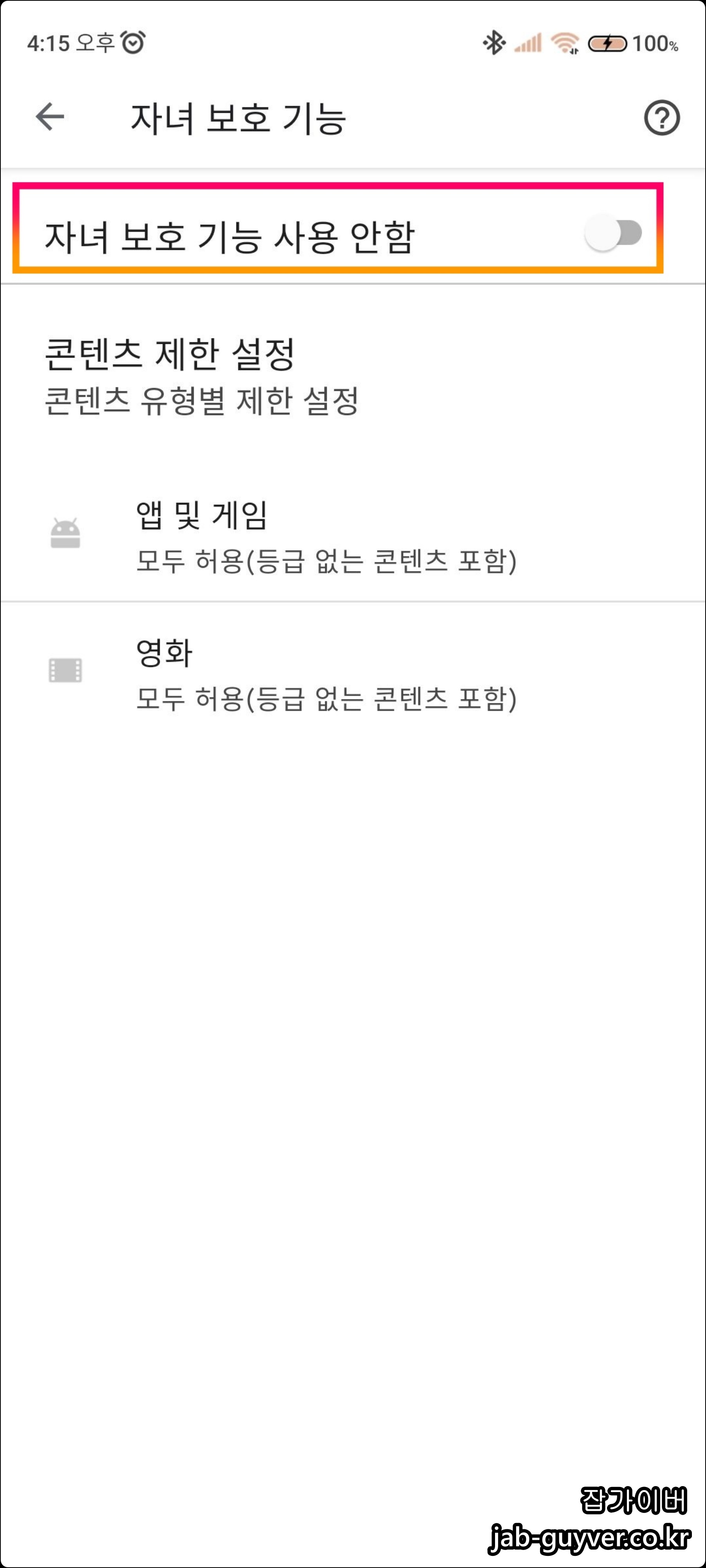 그리고 성인콘텐츠등을 차단하고 싶다면 자녀보호기능 사용안함 체크해제합니다.