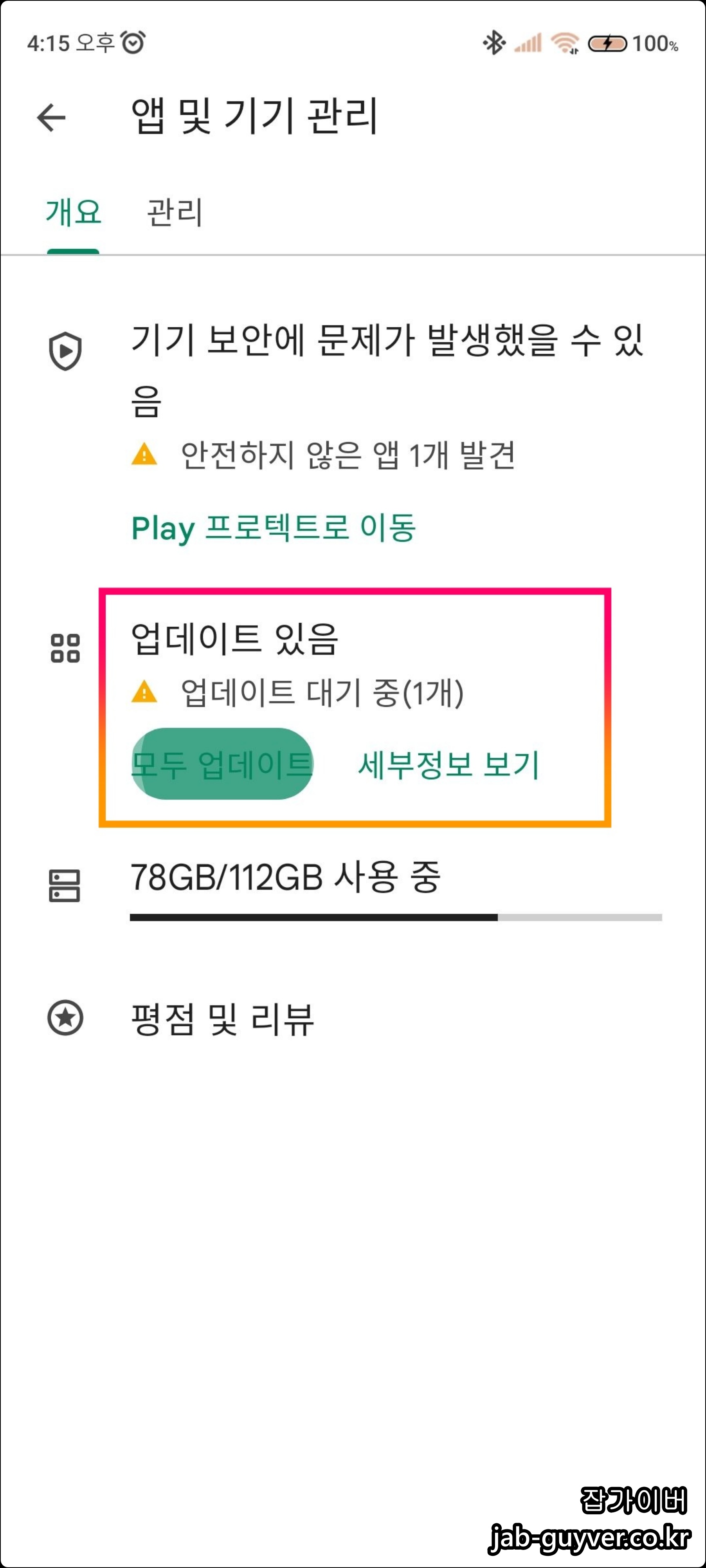 현재 안드로이드 앱 모두 업데이트 하고 싶다면 플레이스토어 설정 -> 앱 및 기기관리로 들어가 대기중에 있는 업데이트 항목을 모두 업데이트 합니다.