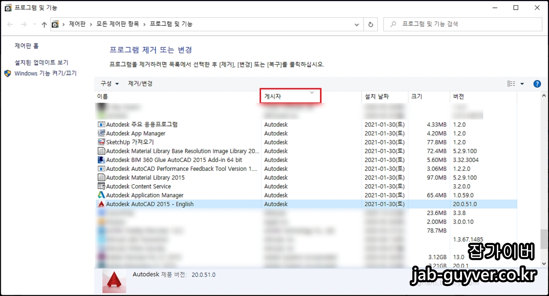 게시자 항목에서 보여지는 Autodesk 항목의 프로그램으로 보이는 오토캐드 삭제하면 뭘 삭제해야하는지 헷갈리지 않습니다.