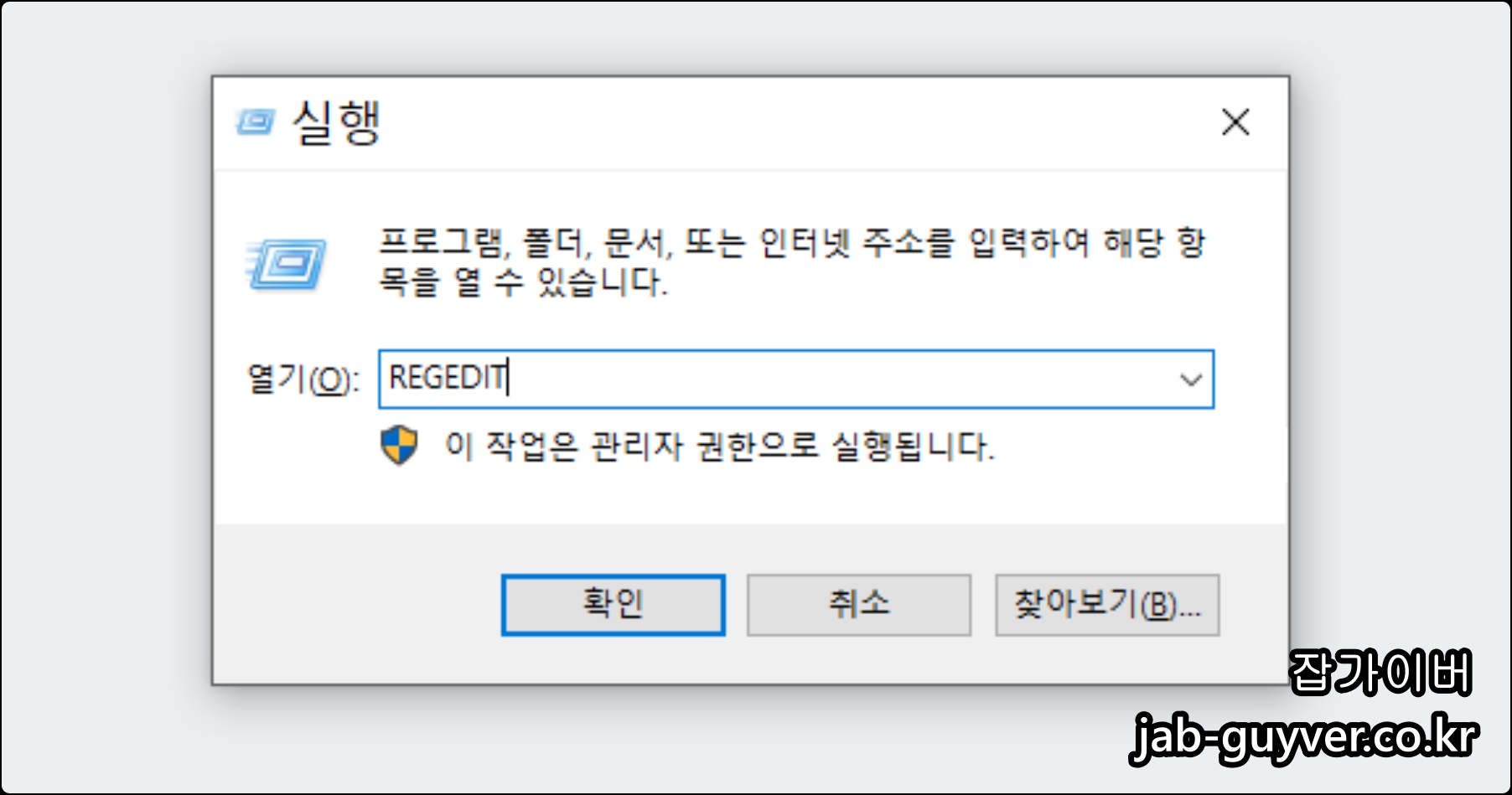 윈도우 키 + R을 눌러 실행창 Regedit 입력 후 확인을 눌러 레지스트리 편집기를 실행합니다.