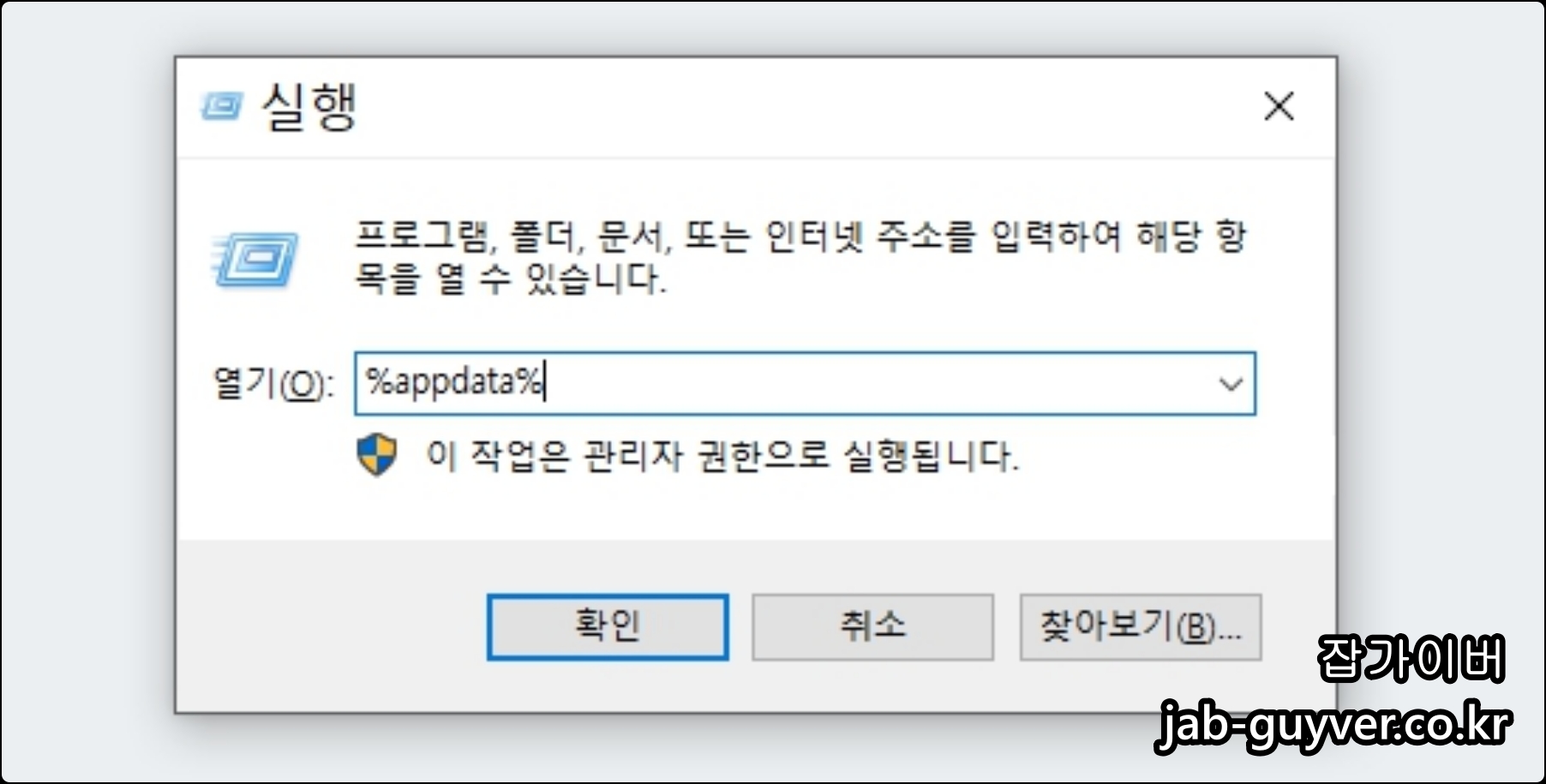 윈도우 키 + R을 눌러 실행창에 %appdata% 입력 후 엔터를 눌러 로밍 앱데이터 폴더를 실행합니다.