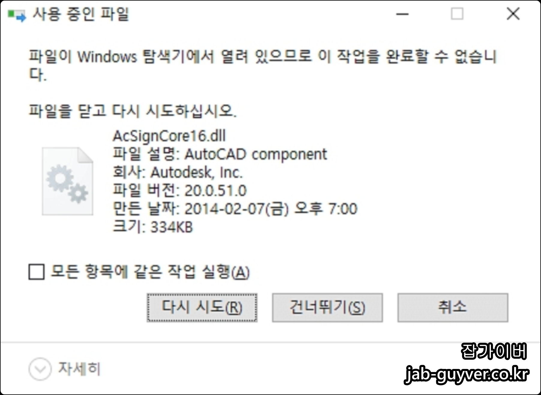 만약 해당파일 삭제중 AcSignCore16.DLL 파일등이 사용 중인 파일로 인해 삭제가 되지 않는 경우가 있습니다.