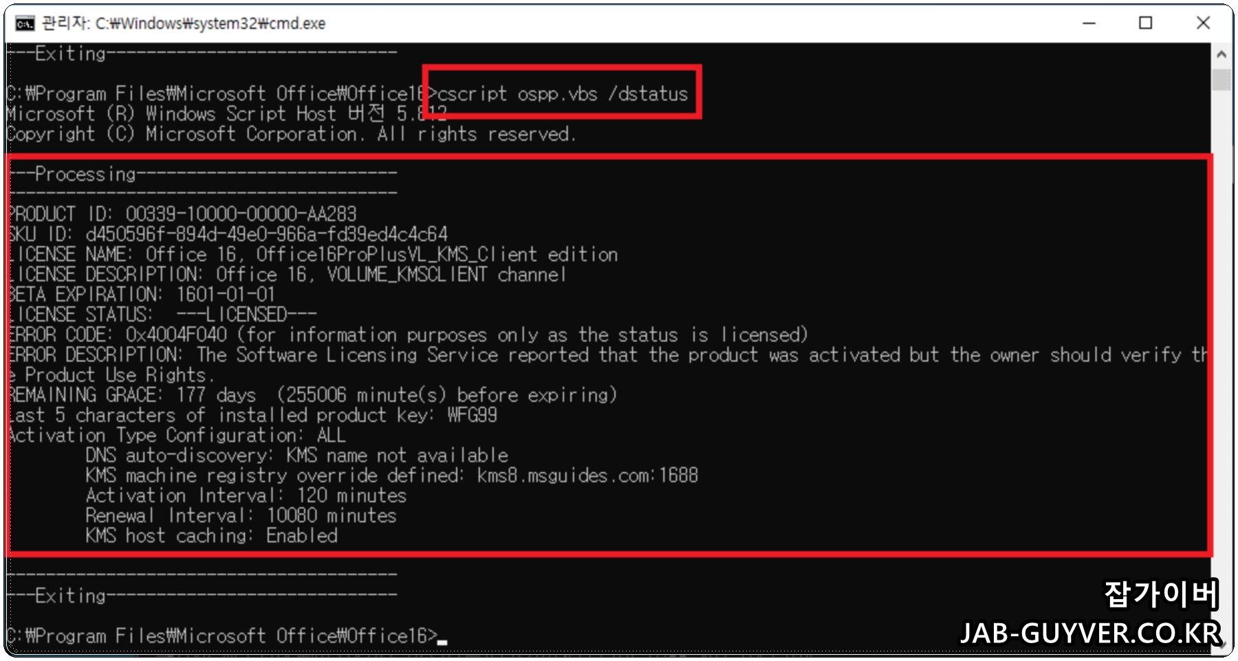 추가로 아래 명령어를 입력해 제품키 활성화합니다.