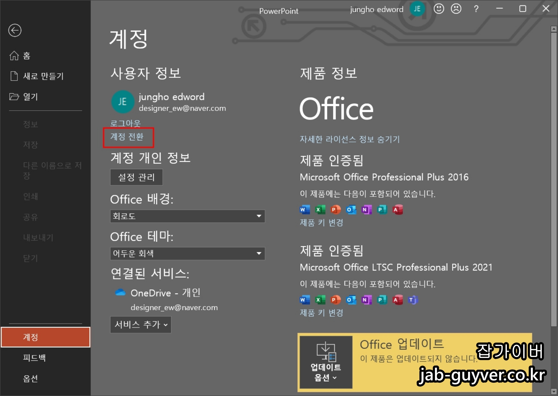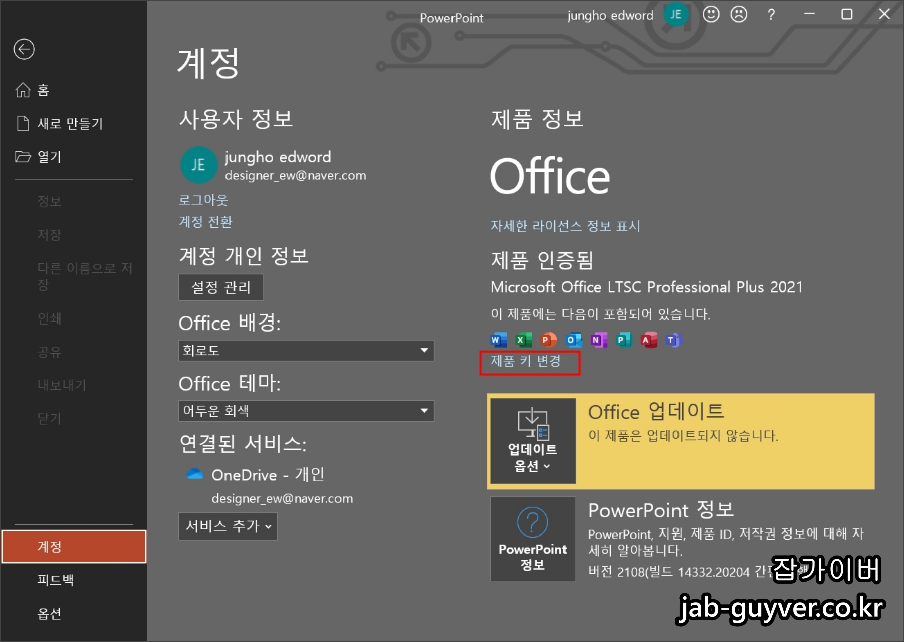 파워포인트를 예를 들어 실행하면 계정에서 제품키 변경을 통해 엑셀, 워드, 파워포인트, 아웃룩 등 다양한 앱인증을 새로합니다.