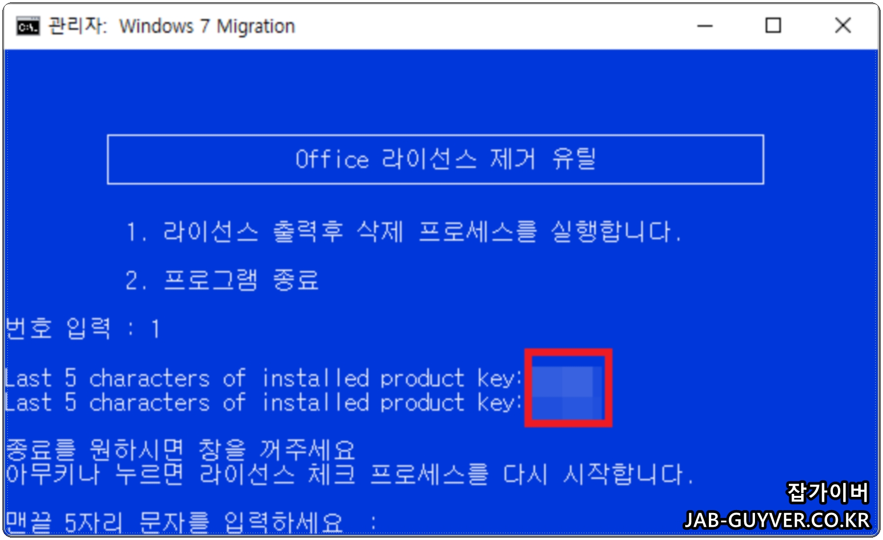 위에서 현재 등록된 오피스 제품키 확인했다면 아래 명령어를 통해 현재 등록된 오피스 제품키 삭제합니다.