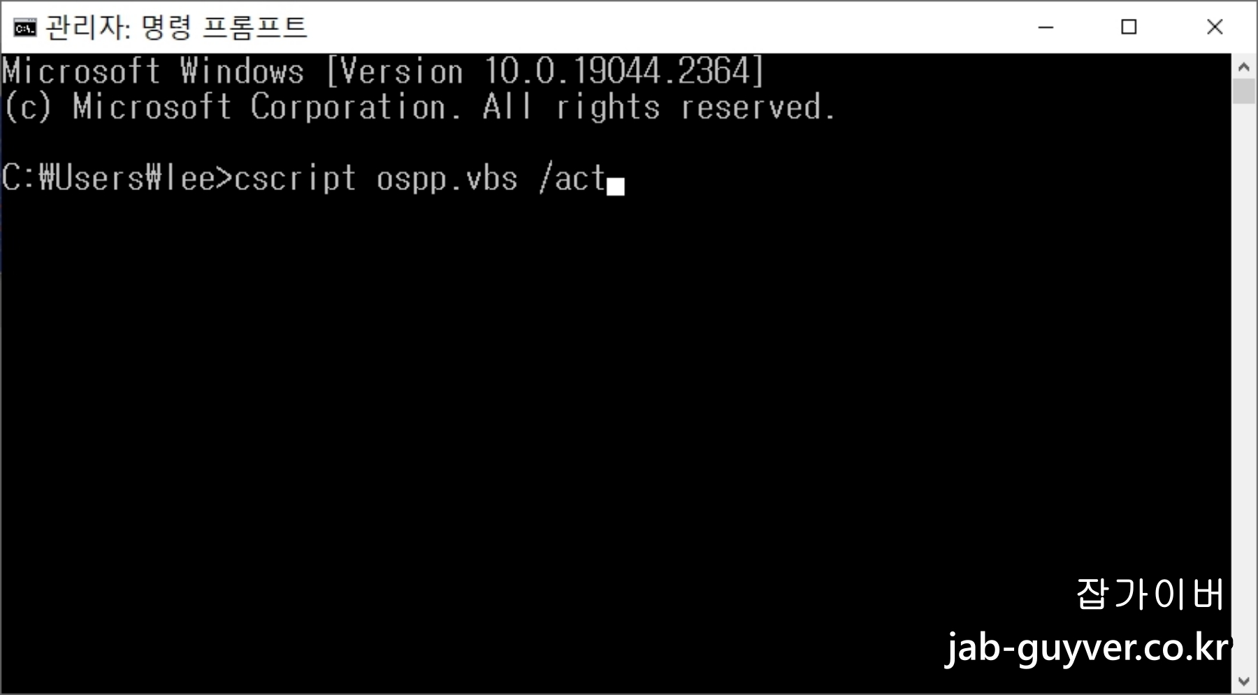 추가로 아래 명령어를 입력해 제품키 활성화합니다.